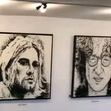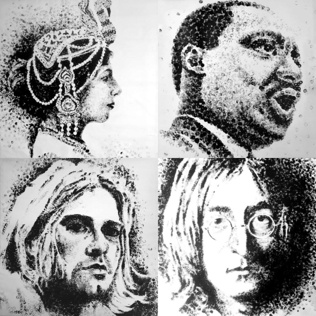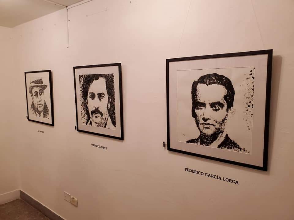 El cerebro humano y sus misterios, que hacen que la visión del espectador asuma como imágenes conocidas la multiplicidad de impactos en el lienzo. Hábiles los artistas que asumen esta debilidad humana – por lo bello – y crean piezas punto a punto. Esta vez Andrey Quintana vuelve a tomar como en 2017 su «arma» (qué paradoja de la vida, el casquillo de un proyectil disparado se convierte en el instrumento de impacto para dejar su huella) y como ráfagas van dibujándose los rostros de artistas, políticos, figuras, todas con algo en común…