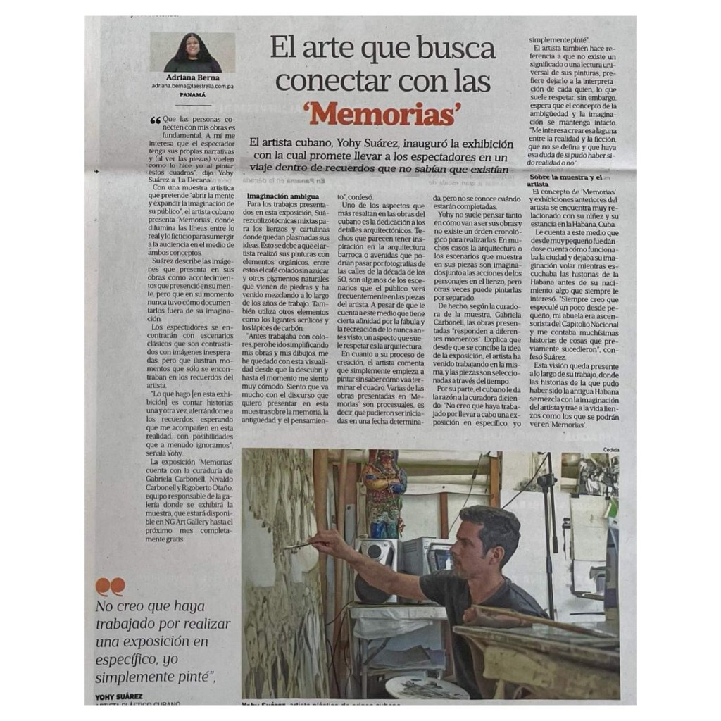 “Las obras de Yohy Suárez están impregnadas de una energía traviesa, como una suerte de tormenta que aborda al espectador, arrastrándolo hacia la anarquía y la locura. Cada pieza es una danza caótica, un compendio de memorias, un tejido de momentos que se aproximan, se alejan y se cortan (…) Memorias exhibe un cuerpo de trabajo que resume la investigación que Yohy Suárez ha venido desarrollando en los últimos años. Sus piezas sugieren elementos ocultos, interrogantes, que se manifiestan en la yuxtaposición de pigmentos naturales como el café y el carboncillo. Cada una involucra a la ciudad como escenario por excelencia; a una humanidad, deformada y fragmentada; y finalmente al espectador, como elemento de cierre. Cada obra es una invitación al ojo de la tormenta, a dejarse llevar por la fuerza de ese caos que, de alguna manera, contiene su propia belleza, su propio orden latente.”
