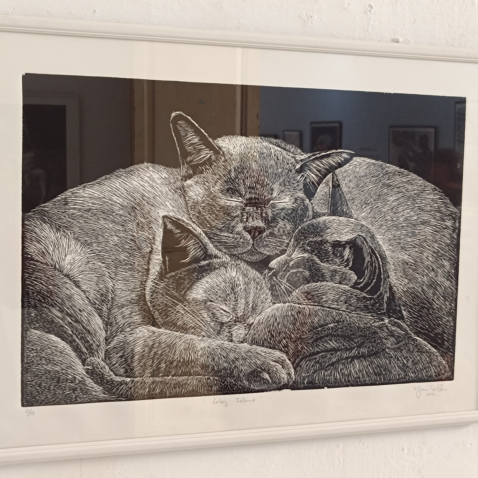 En tres tiempo viene a ser una especie de recorrido por las anteriores exposiciones de la artista emergente Yailén Sellén, algo así como la presentación de su obra al público habanero, que solo ha podido interactuar con ella desde el estudio taller que comparte con el artista también grabador Marcel Molina o a través de las redes sociales. Pero esta joven tiene ya un recorrido expositivo donde ha destacado por su técnica de grabado xilográfico de mediano y gran formato. A diferencia de otros exponentes de esta técnica, los temas que aborda la artista me refleja un mundo interior puro, donde ocupan un lugar primordial los animales (perros y gatos), el mar y las olas, y la representación de la mujer desde una mirada feminista.