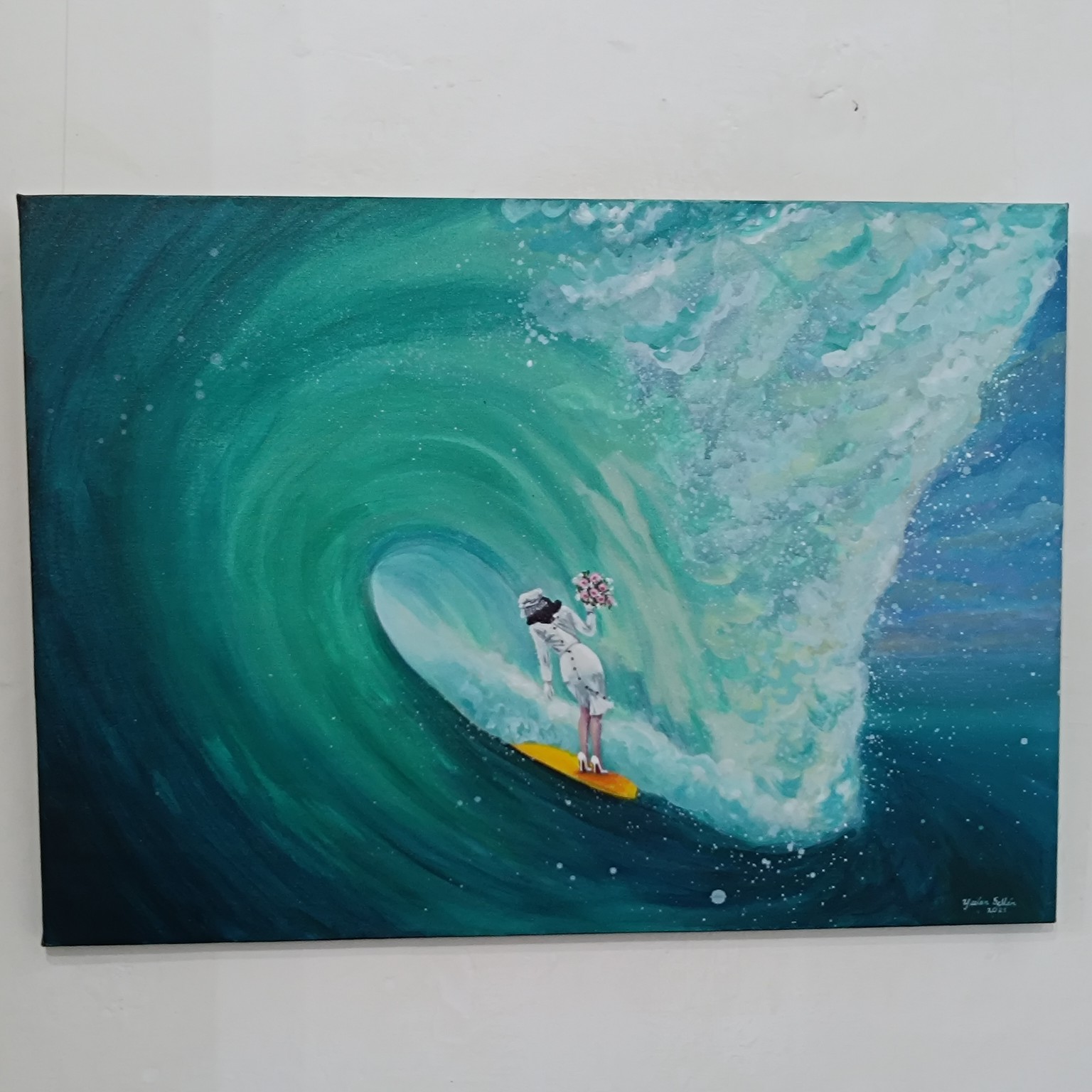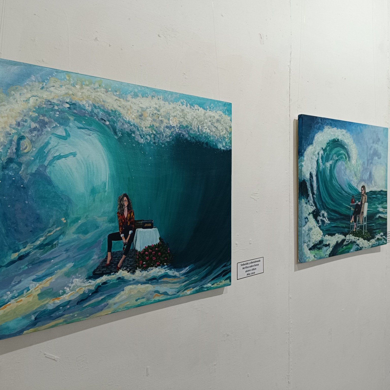 La siguiente sala, se puede observar la obra de la artista relacionada con el mar y las olas, en la cual se pueden apreciar los diversos matices y tonalidades del agua a partir de la destreza en el uso de la técnica escogida y ahora el gran formato, capturando de manera magistral la fuerza y el movimiento del mar. La artista logra transmitir la sensación de libertad que se siente al estar en contacto con la naturaleza, especialmente con el mar, en donde se pueden observar las olas como un elemento que nos conecta con el mundo natural.