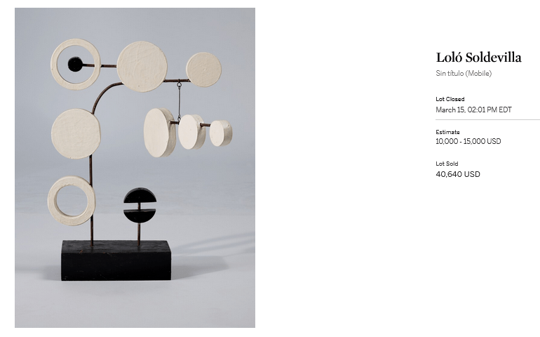 Loló Soldevilla (1901-1971) es considerada una de las artistas más importantes de la abstracción geométrica en Cuba. Su obra, caracterizada por el uso de formas puras y colores vibrantes, ha sido exhibida en relevantes museos y galerías internacionales. La obra subastada, “S/T (Mobile)” (1967), alcanzó un precio de 40.640,00 dólares, lo que refleja la importancia de la artista en el mundo del arte contemporáneo. La obra de Lólo Soldevilla es altamente valorada en el mercado internacional debido a su gran influencia en el desarrollo del arte abstracto en Cuba. Soldevilla fue una de las fundadoras del grupo “Diez Pintores Concretos” en La Habana, el cual se enfocaba en el arte abstracto geométrico y en la exploración de las formas puras y los colores brillantes. Su obra se caracteriza por una preocupación por la relación entre la forma y el espacio, lo que la hace altamente apreciada en el mundo del arte contemporáneo.