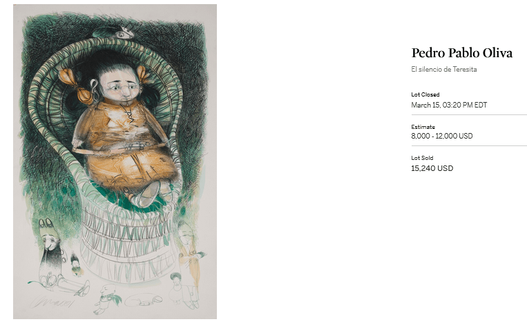 Por otra parte, la obra subastada de PPO, “El silencio de Teresita” (2001), un bello dibujo (tempera/carboncillo) sobre papel de 101,3 x 66,4 cm, se vendió por un precio significativamente más alto que su estimación inicial que lo ubicaba entre 8000 y 12000 USD, cerrando la puja online en 15.240,00 USD, lo que refleja la creciente relevancia del artista en el mercado internacional. Pedro Pablo Oliva (1949-) es uno de los artistas más reconocidos de la escena artística cubana actual por el mercado internacional debido a su habilidad para retratar la vida cotidiana en Cuba con un estilo único y altamente expresivo. Oliva es un artista multidisciplinario que trabaja con pintura, dibujo, grabado y escultura. Su obra se caracteriza por una mezcla de realismo y simbolismo, y por su fuerte crítica social y política. Además, la obra de Oliva es buscada por los coleccionistas debido a su rareza. Muchas de sus obras se encuentran en colecciones privadas o institucionales, y su producción es limitada.