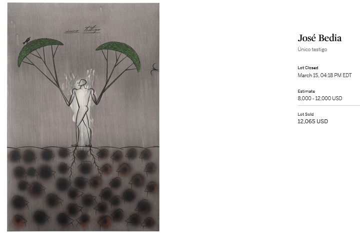 José Bedia (1959-) es uno de los artistas más reconocidos de la escena artística cubana actual. Su obra, que se inspira en las culturas afroamericanas y prehispánicas. La obra subastada, “Único testigo” se vendió justo al límite máximo de la estimación, lo que refleja la relevancia del artista en el mercado internacional.