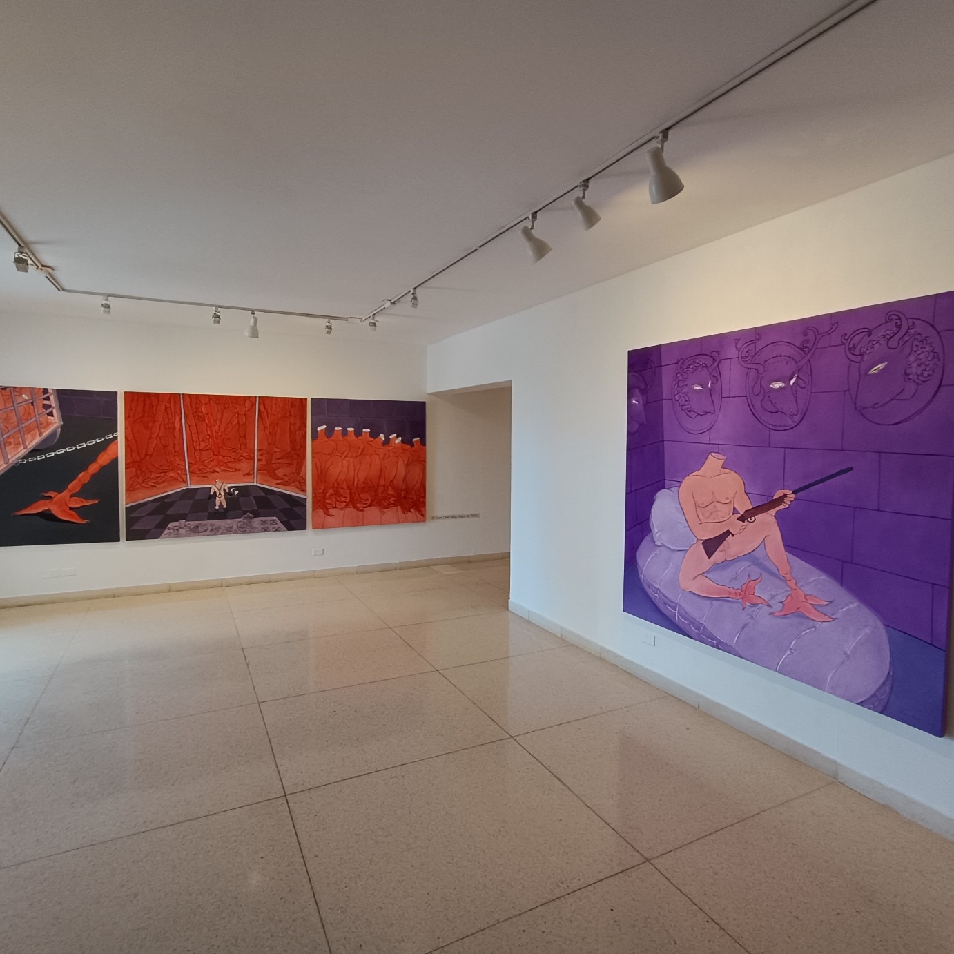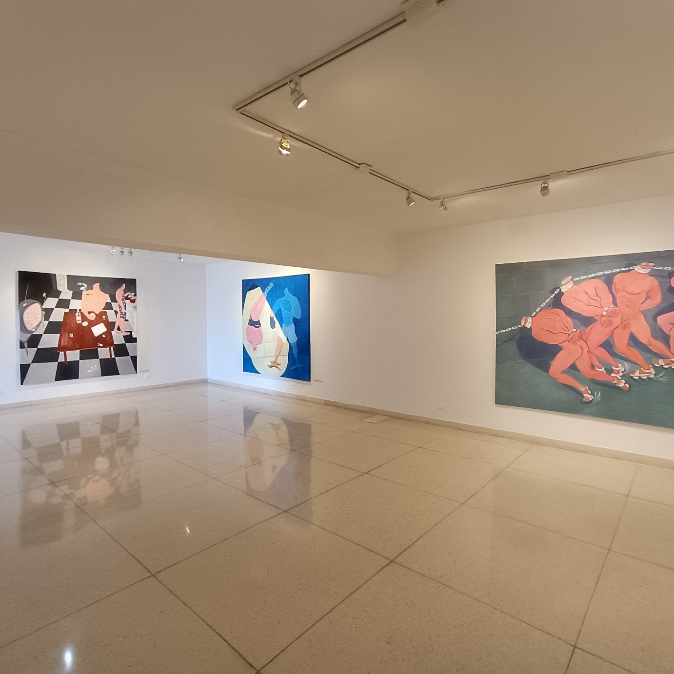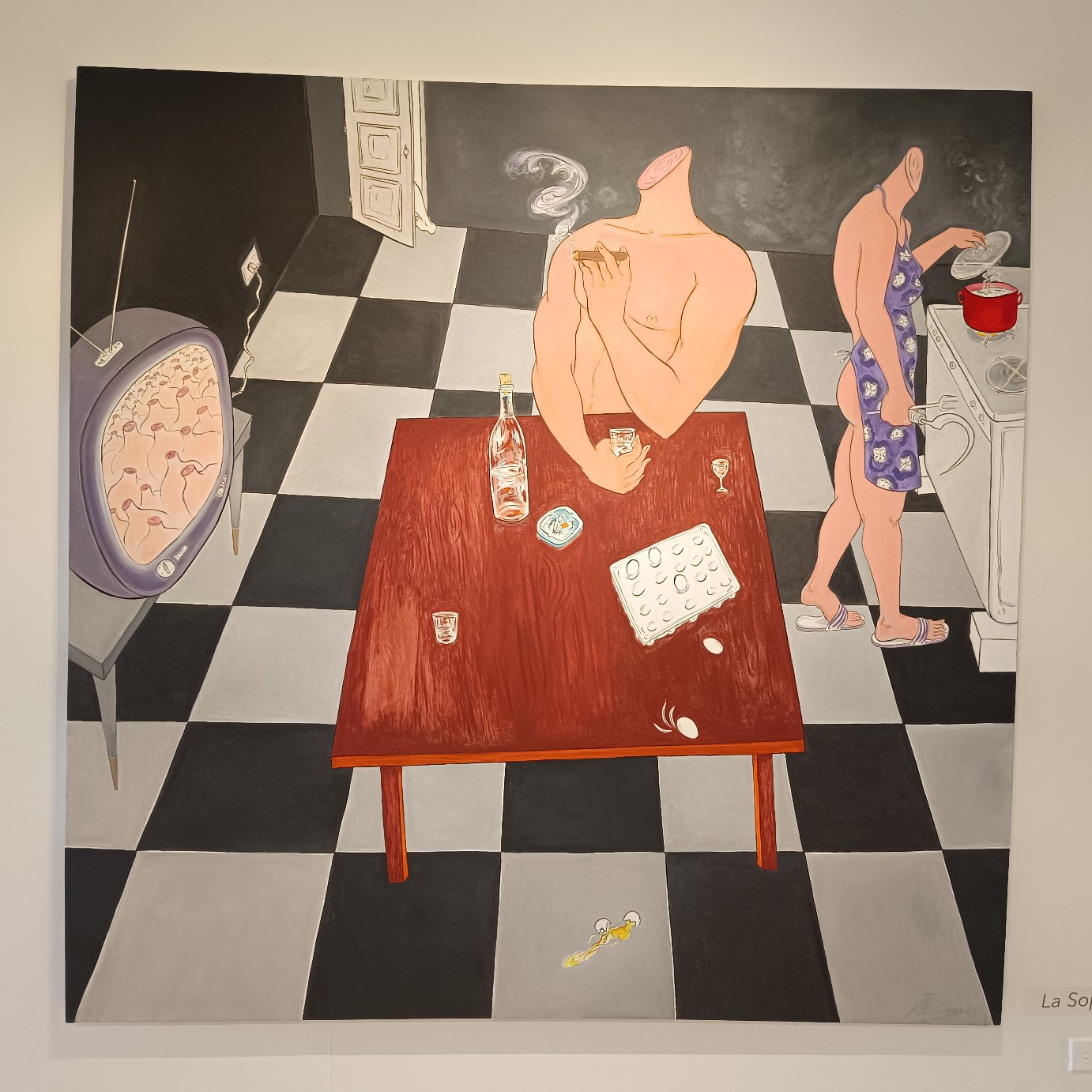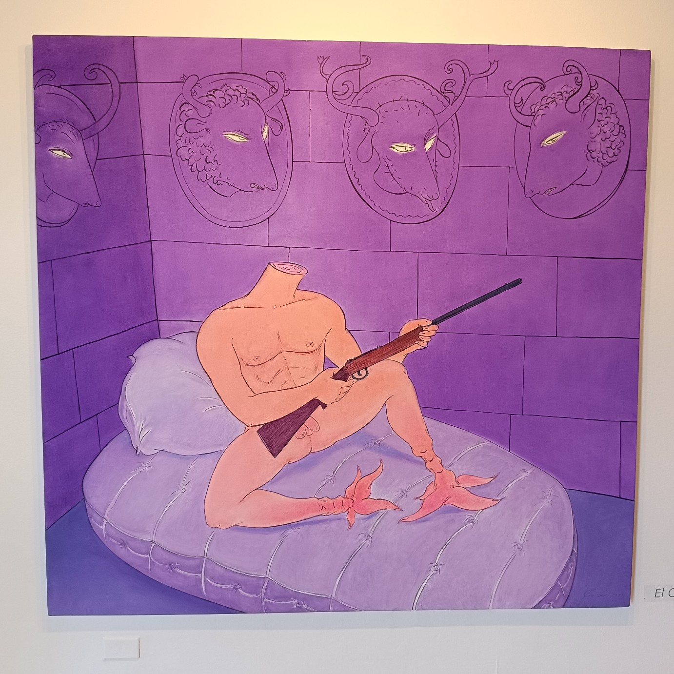 La última exposición de Rocío García, «El Gran Chef (alias Patica de Pollo)», sumerge al espectador en un mundo distópico en el que seres humanoides, todos despojados de sus cabezas y algunos dotados de patas de gallina en lugar de pies, reflejan las complejas luchas de poder y los cambios sociales que caracterizan nuestra época. A través de una serie de lienzos impresionantes, García logra trazar paralelismos entre sus singulares criaturas y las sociedades actuales, incluida sin dudas la nuestra, ofreciendo una crítica aguda y penetrante de las jerarquías y desigualdades que nos rodean.