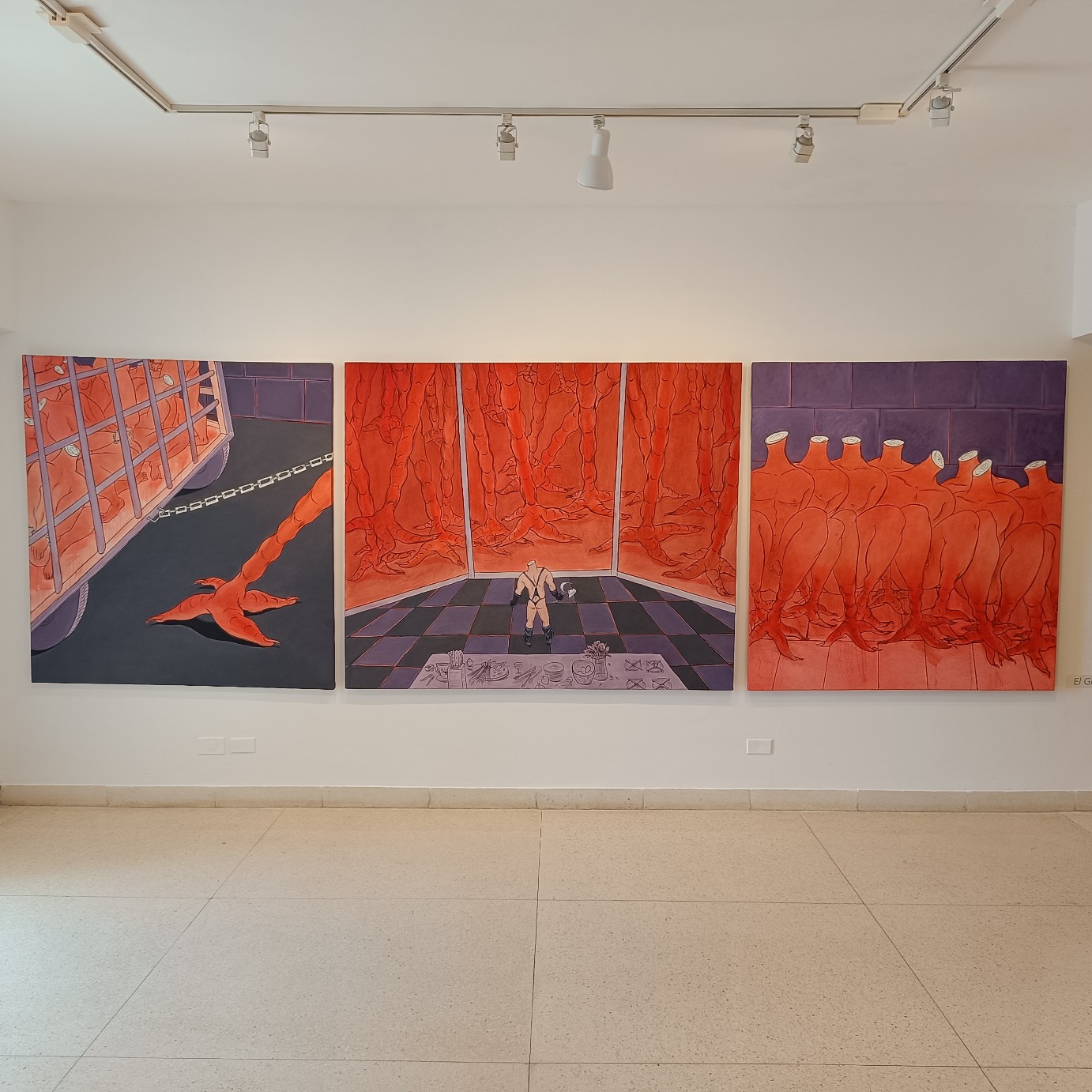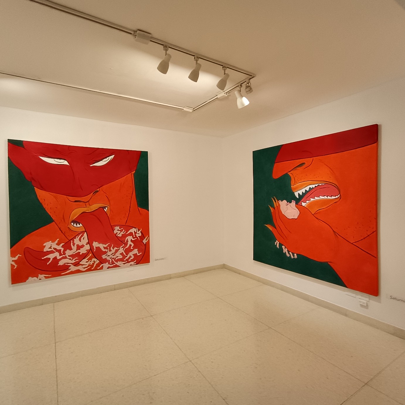 En las obras maestras de la exposición, «Saturnino I» y “Saturnino II”, García presenta a los miembros dominantes quienes ostentan cabezas y devoran sin piedad a los seres subyugados, simbolizando el poder opresivo de aquellos que controlan a la mayoría en las sociedades jerárquicas. Por otra parte, en el tríptico homónimo a la muestra, la dinámica de poder de los grupos se alterna. En una de las secciones humanoides mutantes con patas de gallina ejercen control sobre otro grupo de seres igualmente desfigurados y decapitados enjaulados, mientras que en el extremo de la pieza, son los primeros los que se ubican en posición de sumisión y control, al estar sentados en el piso y en grupos con las manos atadas a la espalda.