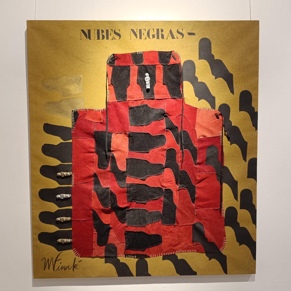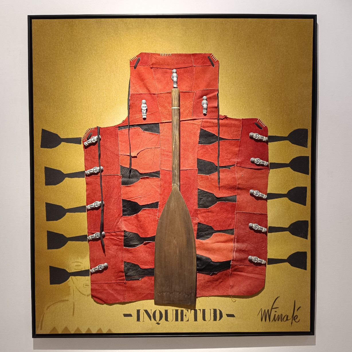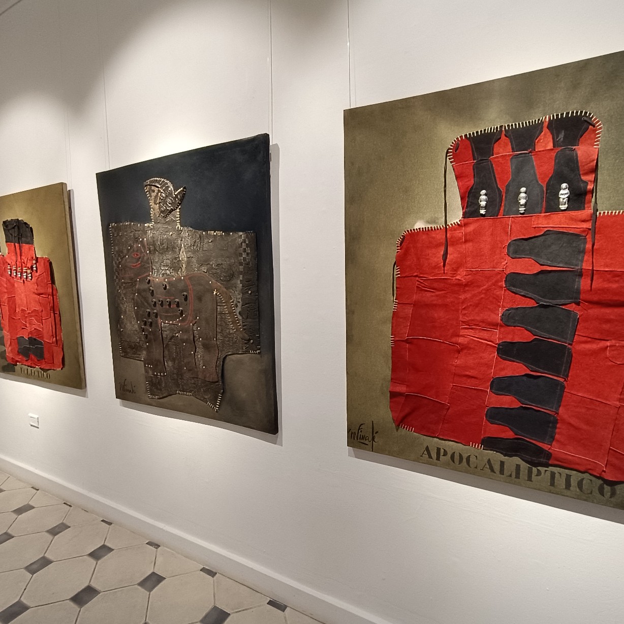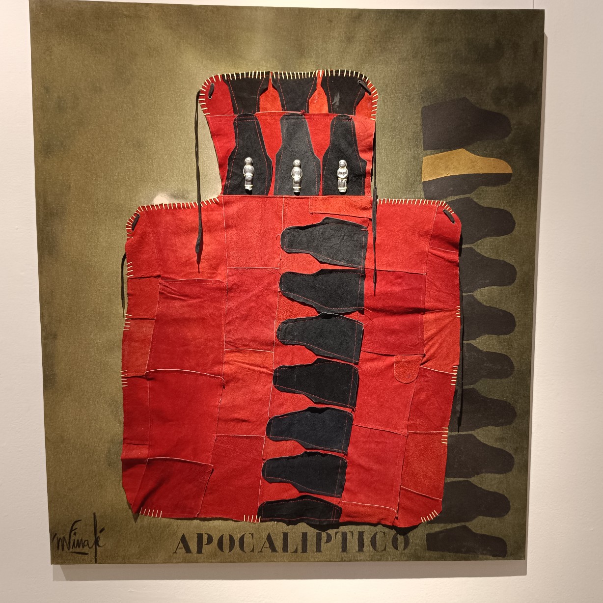 Una de las características más llamativas de la exposición es el uso recurrente del peto de soldador como elemento visual. Finalé interviene y reinterpreta este objeto cotidiano, transformándolo en una metáfora de protección y resistencia frente a las adversidades y la marginación. Al mismo tiempo, el peto de soldador simboliza la necesidad de romper barreras y construir puentes entre culturas y experiencias diversas. Sin embargo, debajo de los diálogos que generan estos petos, el espectador puede percibir tensiones, conflictos y conexiones emocionales que trascienden las barreras culturales, sociales y personales. Estos diálogos revelan la fragilidad y la fuerza inherentes a la condición humana en medio de la otredad. La reinterpretación e intervención del peto de soldador por parte de Finalé se convierte en un elemento central y unificador en su obra actual.