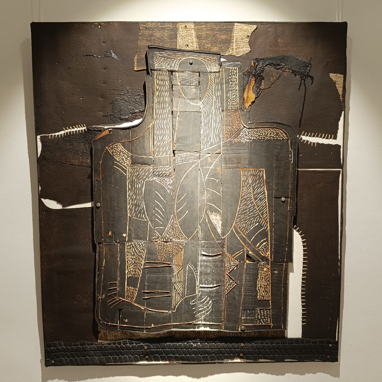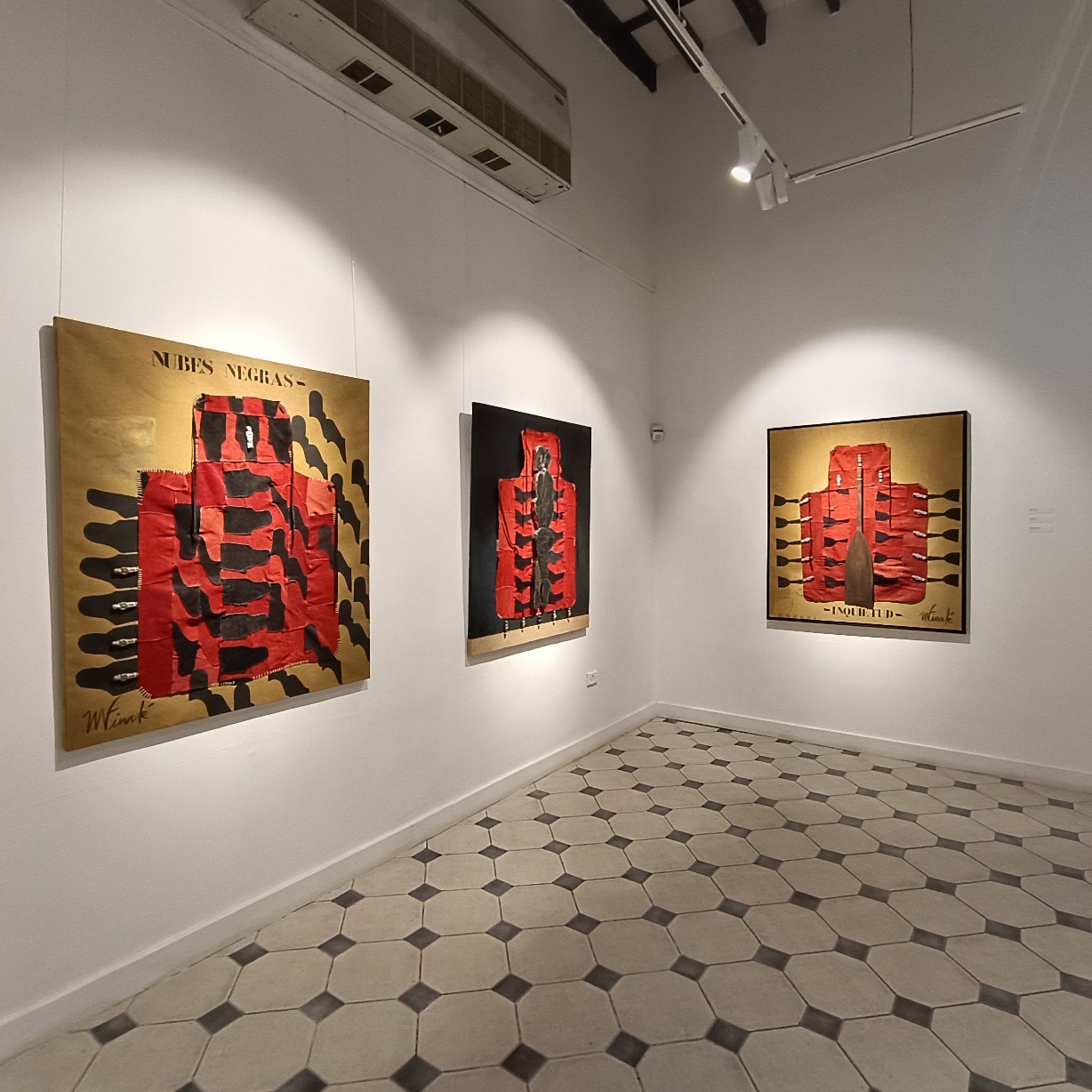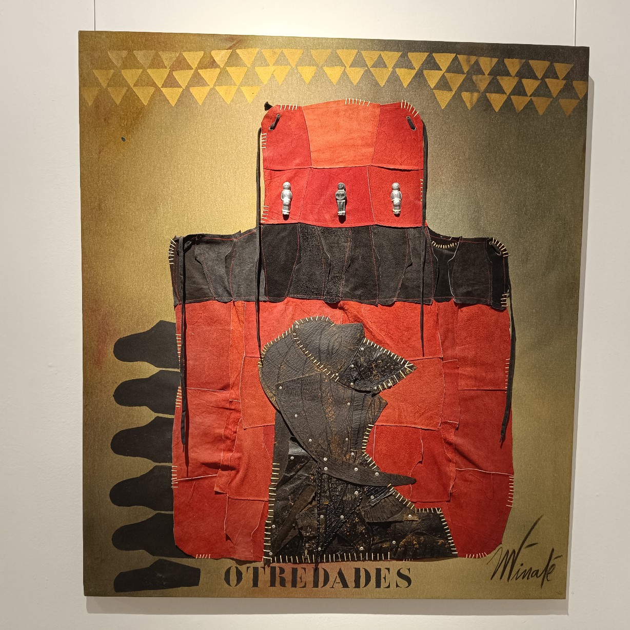 Una de las características más llamativas de la exposición es el uso recurrente del peto de soldador como elemento visual. Finalé interviene y reinterpreta este objeto cotidiano, transformándolo en una metáfora de protección y resistencia frente a las adversidades y la marginación. Al mismo tiempo, el peto de soldador simboliza la necesidad de romper barreras y construir puentes entre culturas y experiencias diversas. Sin embargo, debajo de los diálogos que generan estos petos, el espectador puede percibir tensiones, conflictos y conexiones emocionales que trascienden las barreras culturales, sociales y personales. Estos diálogos revelan la fragilidad y la fuerza inherentes a la condición humana en medio de la otredad. La reinterpretación e intervención del peto de soldador por parte de Finalé se convierte en un elemento central y unificador en su obra actual.