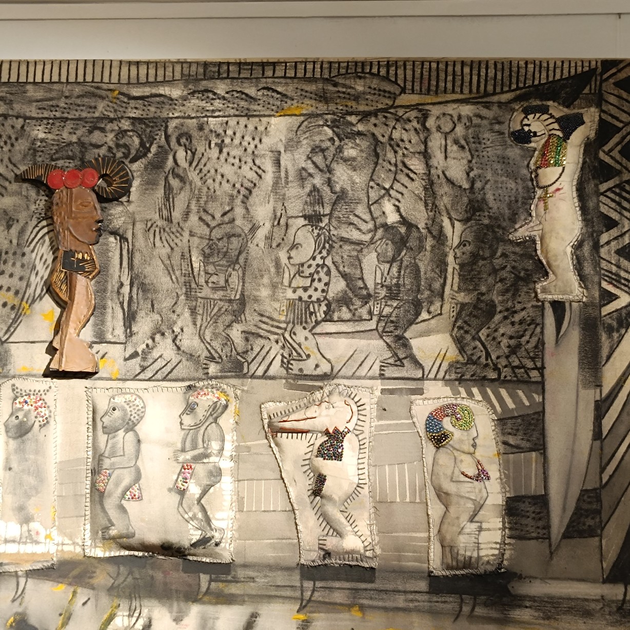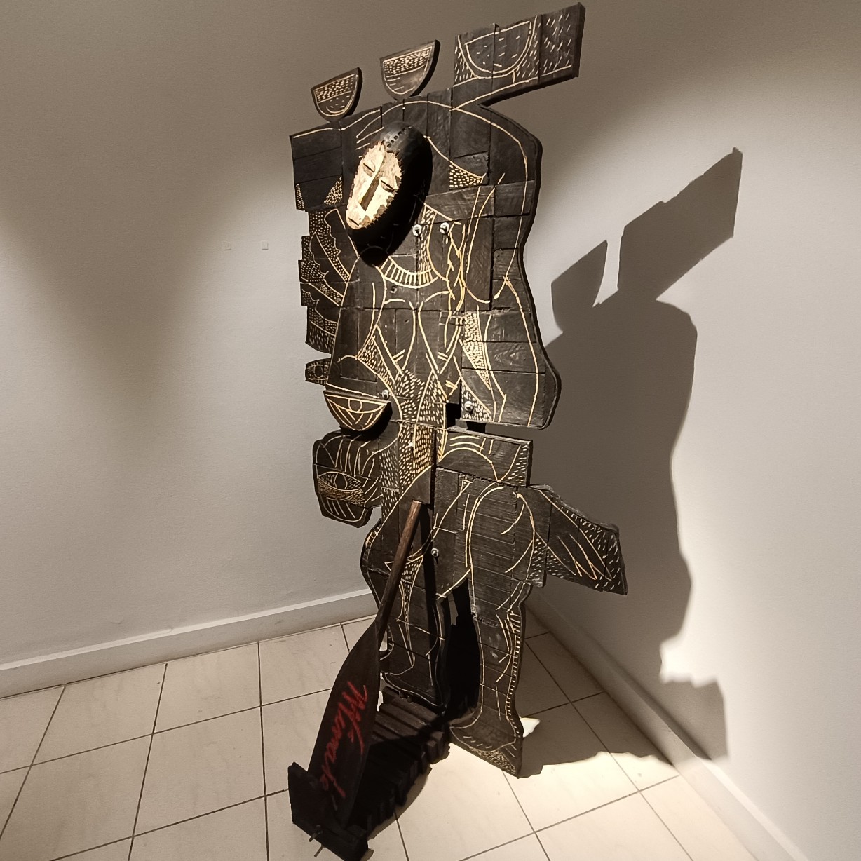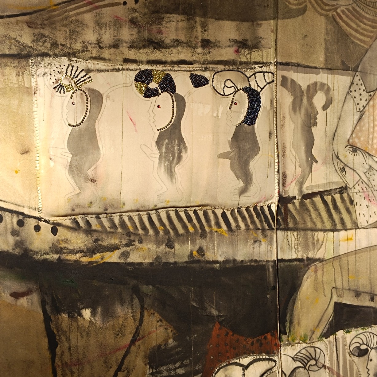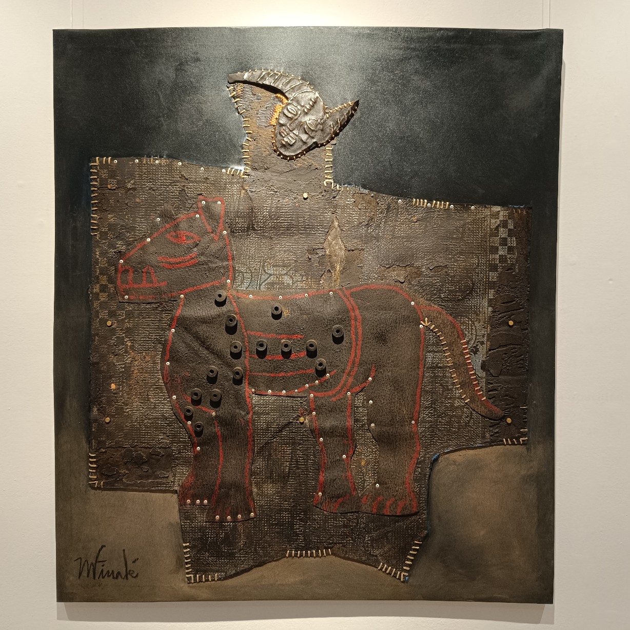 Una de las características más llamativas de la exposición es el uso recurrente del peto de soldador como elemento visual. Finalé interviene y reinterpreta este objeto cotidiano, transformándolo en una metáfora de protección y resistencia frente a las adversidades y la marginación. Al mismo tiempo, el peto de soldador simboliza la necesidad de romper barreras y construir puentes entre culturas y experiencias diversas. Sin embargo, debajo de los diálogos que generan estos petos, el espectador puede percibir tensiones, conflictos y conexiones emocionales que trascienden las barreras culturales, sociales y personales. Estos diálogos revelan la fragilidad y la fuerza inherentes a la condición humana en medio de la otredad. La reinterpretación e intervención del peto de soldador por parte de Finalé se convierte en un elemento central y unificador en su obra actual.