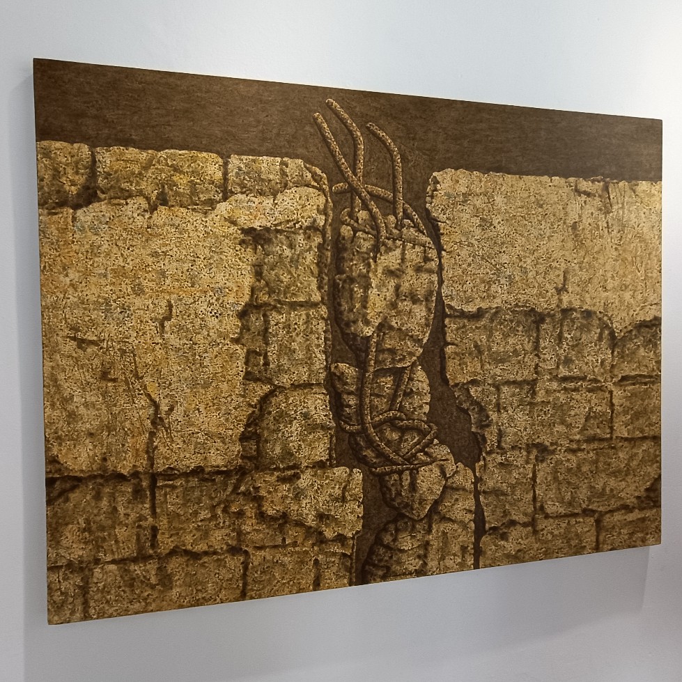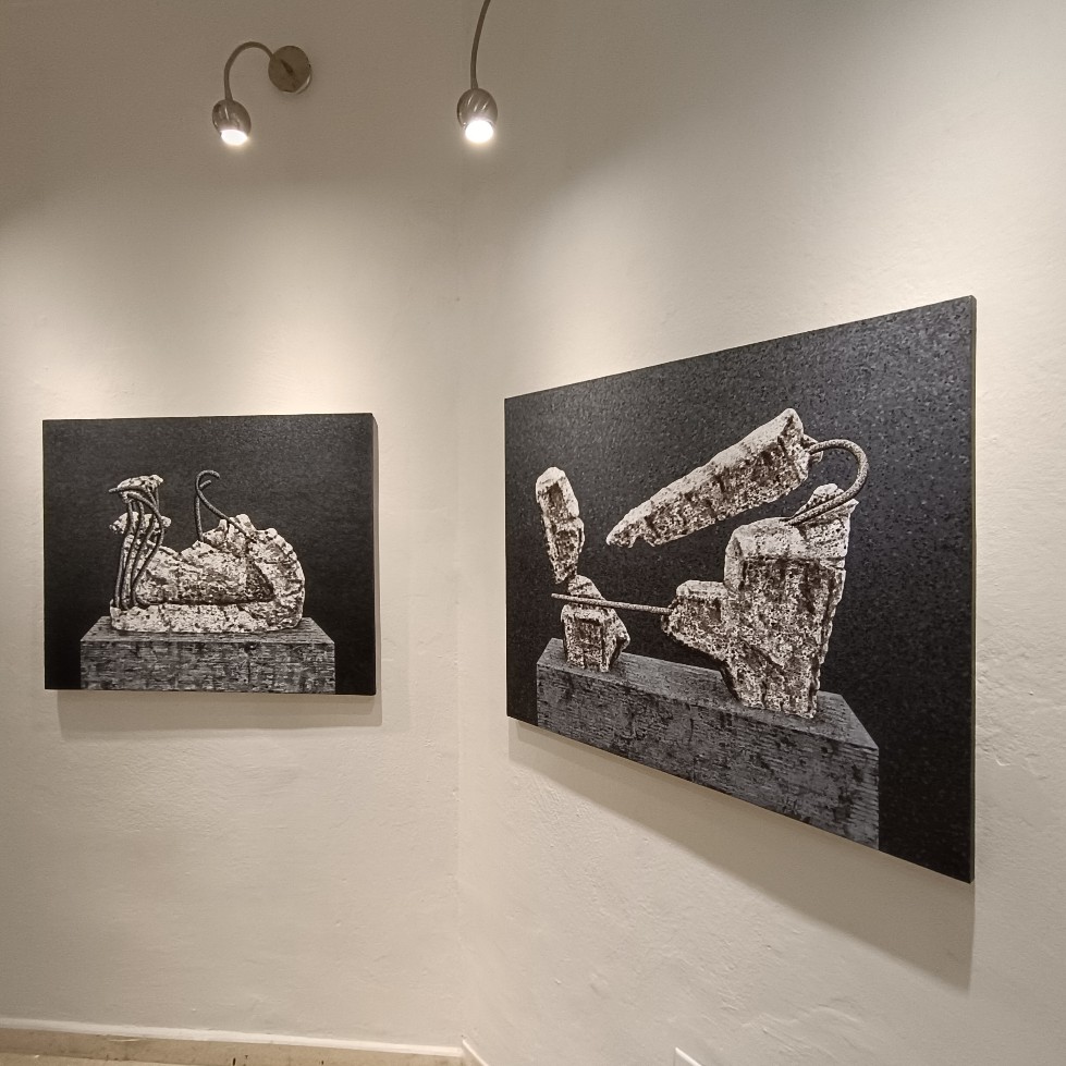 Las obras de Rubén presentan fragmentos de estructuras arquitectónicas en distintos estados de deterioro, mezclados entre sí, que a los ojos del espectador representan figuras humanas como elementos simbólicos. Estas composiciones generan una tensión visual que, al mismo tiempo, refleja la tensión emocional y psicológica que surge en situaciones de desánimo colectivo y desesperanza. El artista consigue transmitir una sensación de resistencia y perseverancia en medio de la adversidad -algo en lo que coincido con la mirada de la curadora Ariadna Cabrera-, utilizando elementos arquitectónicos como metáforas de la fortaleza y la resiliencia del espíritu humano.