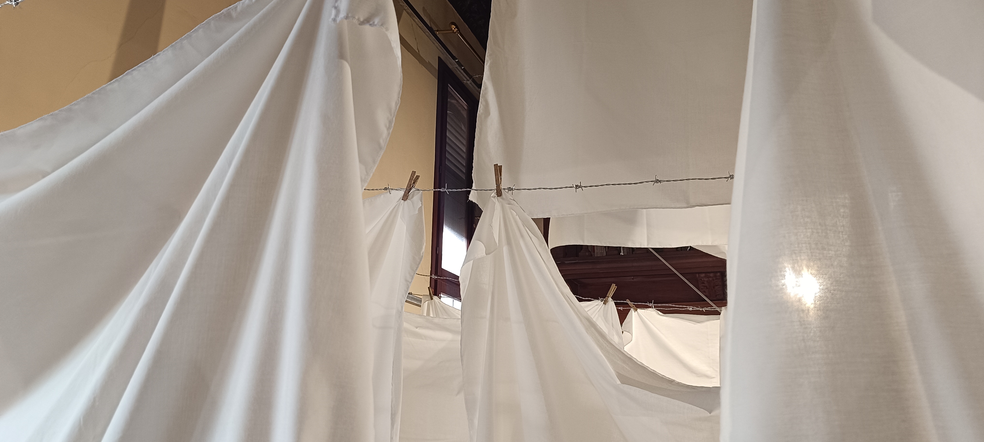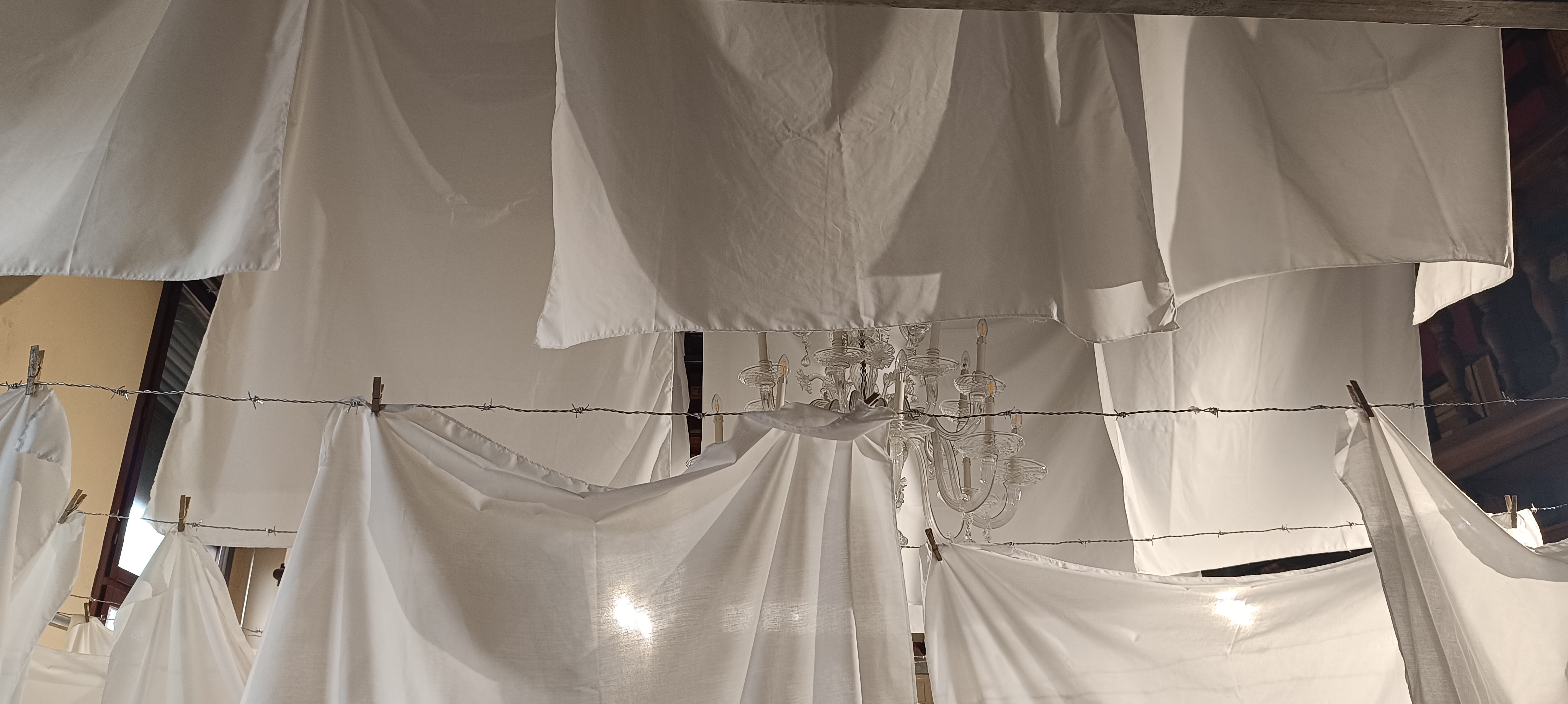 A nivel de instalación y performance, la exhibición es absolutamente cautivadora. Un espacio lleno de sábanas blancas, creando un laberinto a través del cual los visitantes deben navegar, implicándolos en la desorientación y el desplazamiento de la experiencia migratoria. A su vez, el uso de nuevos medios y tecnologías digitales amplía aún más la capacidad de Mirabal para jugar con la percepción del espacio y la arquitectura.