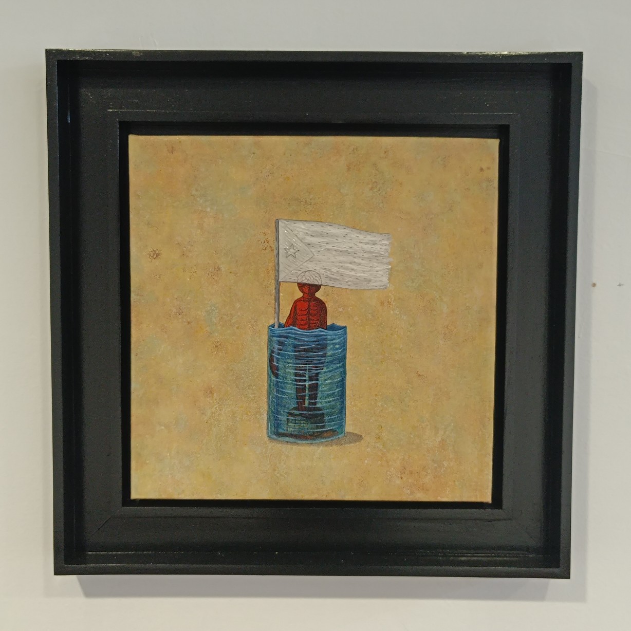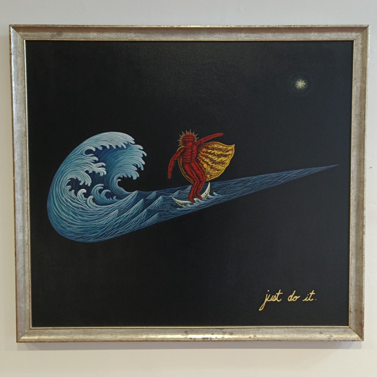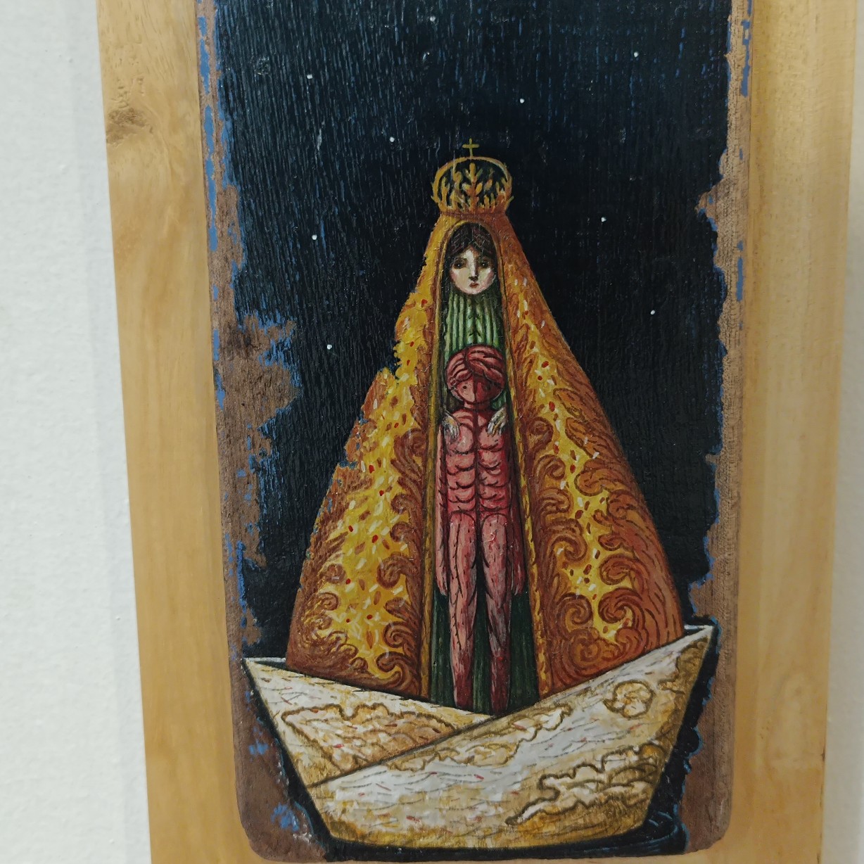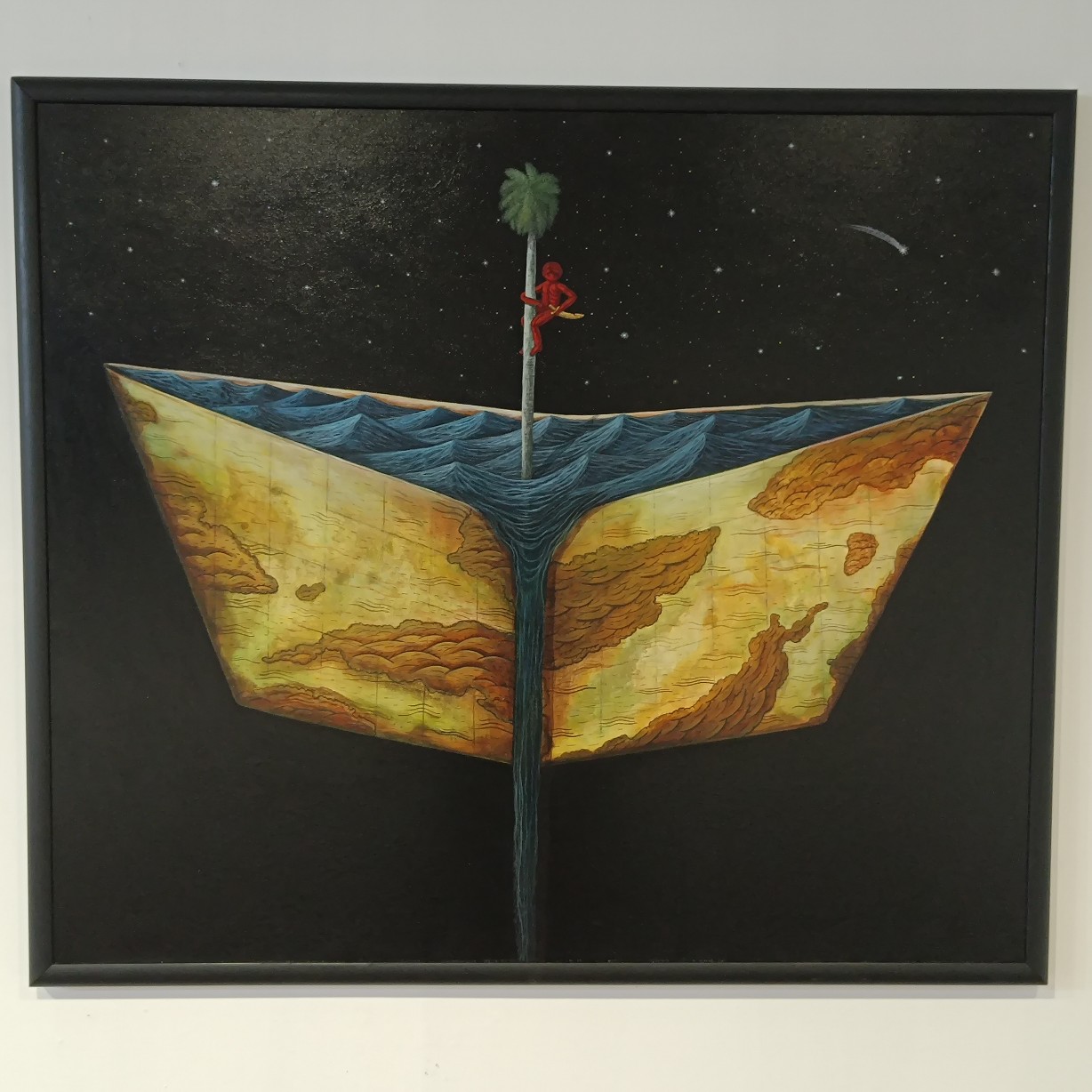 Por otra parte, la versatilidad de Rolo Fernández en el uso de técnicas y medios es evidente en la exposición. La coexistencia de dibujos sobre cartulina, acrílicos y óleos sobre lienzo, y piezas mixtas denota un repertorio ecléctico y versátil que permite al artista expresar su visión de manera variada y dinámica. Cada técnica trae consigo una experiencia estética única, y Fernández las aprovecha con ingenio para explorar las múltiples facetas de su alter ego, Súbito.
