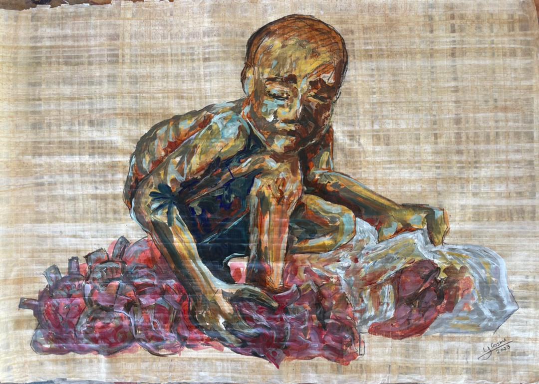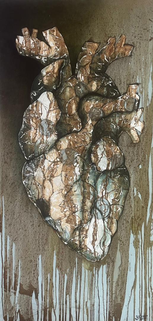 Sumergiéndose en las raíces más profundas de la historia, el artista opta por el papiro, ese venerable lienzo que sirvió de testigo a los relatos y secretos de la antigua civilización egipcia. Con este medio, él reinventa y ofrece una perspectiva fresca y audaz al arte contemporáneo. No se trata de cualquier papiro; cada hoja es meticulosamente seleccionada, buscando aquellas que destilen carácter y autenticidad. Posteriormente, son tratadas con esmero para garantizar su durabilidad y resaltar su belleza natural. Sobre estas superficies, con trazos precisos y deliberados, el artista inscribe jeroglíficos y otros símbolos ancestrales que narran emotivas historias impregnadas de pasión, fe y una trascendencia que desafía el paso del tiempo. Y en medio de este aluvión de simbolismo, destaca con preeminencia el corazón. Este órgano, fundamental en la fisiología humana y cargado de significado en la esfera espiritual y emocional, emerge como el héroe silente de la narrativa. Su representación no solo evoca su importancia biológica, sino que también rememora el valor otorgado en la mitología egipcia, donde era considerado el guardián de la verdad, el refugio de la moral y la esencia del ser.