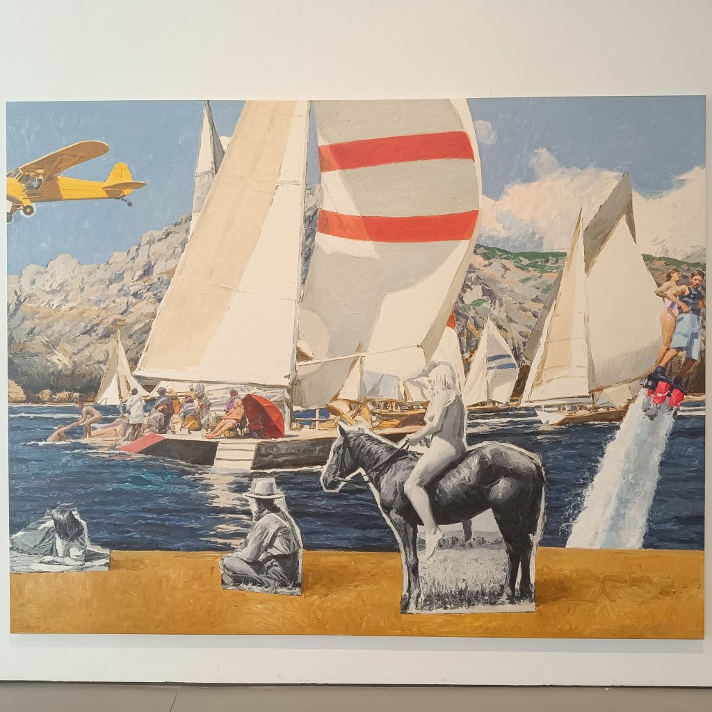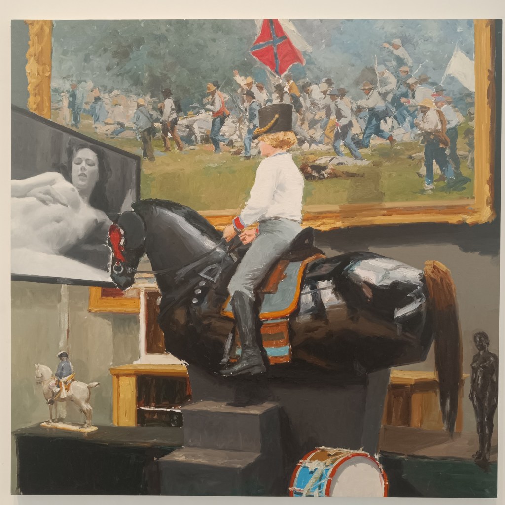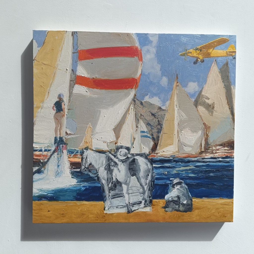 En la obra de Cabrera, una multitud de elementos convergen para crear un estilo inconfundiblemente suyo. Su habilidad para utilizar recursos formales es evidente en la manera en que invoca a la pintura expresionista de fin de siglo XIX, con marcada presencia de Sorrolla, con su rica paleta de colores y sus marcados contrastes de luz y sombra. Pero va más allá, fusionando reconstrucciones históricas que, si bien pueden parecer verosímiles a primera vista, se entrelazan con arquetipos que desafían las normas y nos transportan a escenarios donde el heroísmo se combina con el erotismo. Este balance delicado crea un ambiente idílico, casi onírico, que parece suspendido en el tiempo y el espacio. Y, al igual que un director de cine que teje cuidadosamente su narrativa, Cabrera entrelaza todos estos elementos, asegurándose de que cada detalle, cada matiz, forme parte de una historia más amplia que se desarrolla en la mente del espectador.