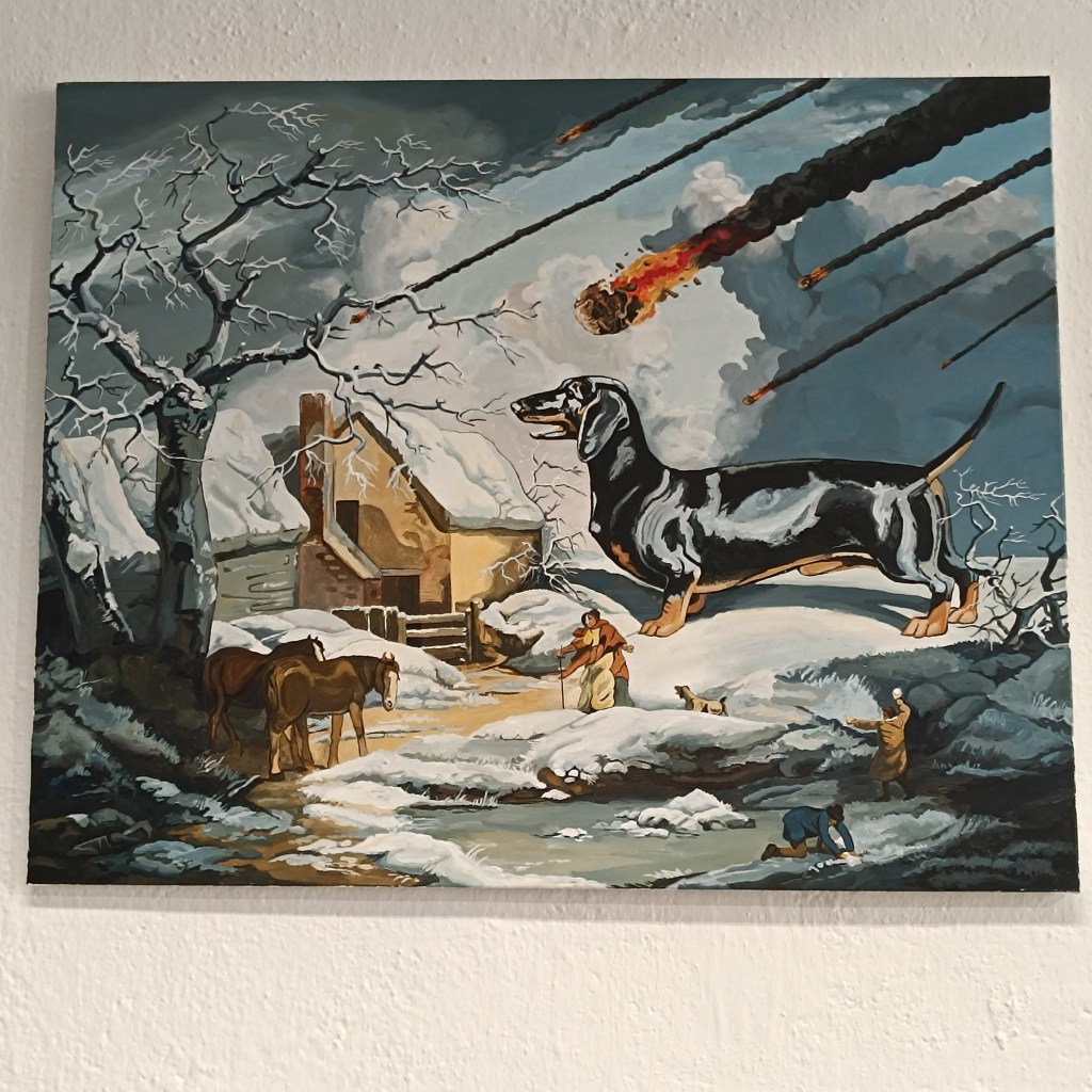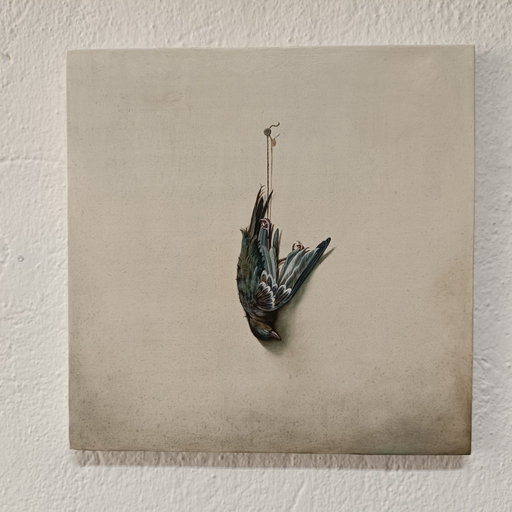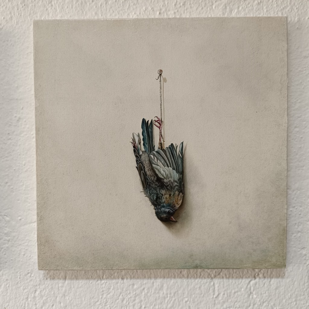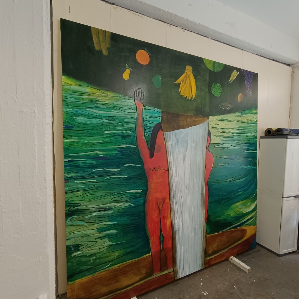 Maikel Sotomayor, quien además de ser artista, desempeña el papel de anfitrión en este espacio, tiene la habilidad de transportarnos con sus pinceles a un rincón del vibrante Caribe. Sus pinturas, que destacan la representación meticulosa de frutas naturales, son más que simples retratos de la naturaleza. Son ventanas a un mundo que combina la realidad con la mitología. Al observar sus obras, nos encontramos envueltos en imágenes que remiten al edén bíblico de Adán y Eva. La paleta cromática que Sotomayor emplea nos recuerda a los cálidos atardeceres caribeños, donde los naranjas, rojos y amarillos se funden con la frescura de los verdes tropicales. Sus pinturas no son solo una celebración visual, sino también una oda a la nostalgia, a esos relatos de origen y a los mitos que han moldeado y enriquecido nuestra identidad cultural a lo largo de los siglos.