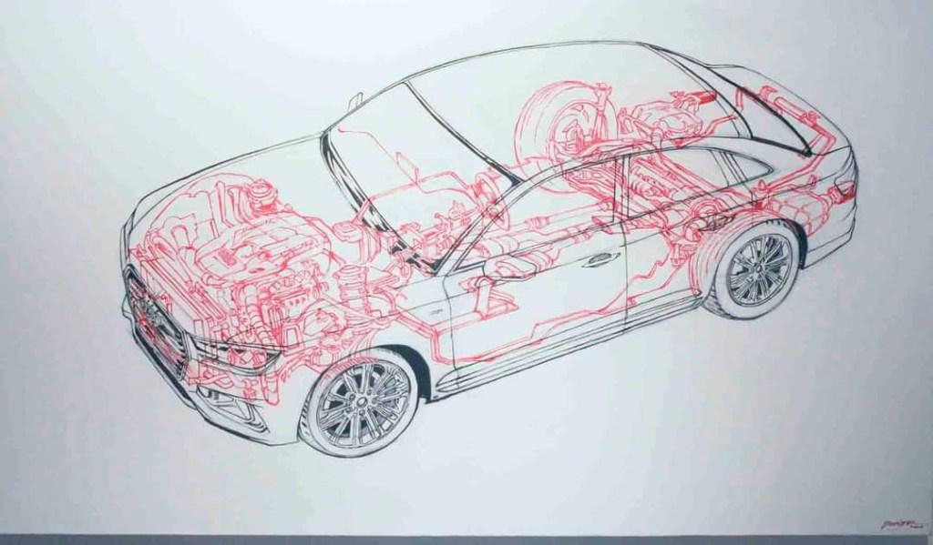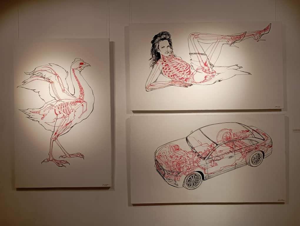 Las imágenes que me llegan a través de las redes, por la imposibilidad geográfica de estar presente, muestran una serie de obras que utilizan una técnica de delineado donde se busca resaltar estructuras internas en una variedad de sujetos, desde figuras humanas hasta animales y objetos. Esta técnica crea una interesante dicotomía entre la forma externa y su complejidad interna, invitando al espectador a reflexionar sobre la naturaleza oculta de las cosas.