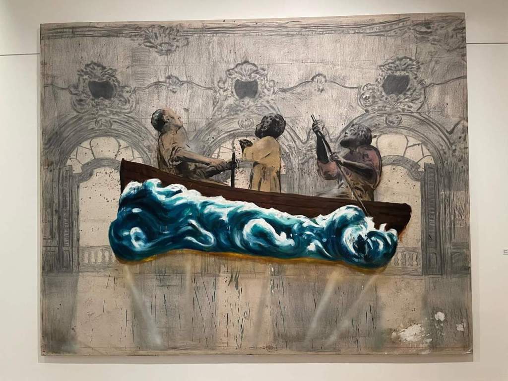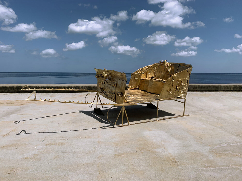 En 2019, tuve la suerte y la oportunidad de participar en el proceso de presentación de la obra «El Trineo» de Enrique Martínez Celaya, exhibida durante la XIII Bienal de La Habana. Esta fue una obra que encapsulaba las dualidades de arraigo y desarraigo, memoria y olvido, permanencia e impermanencia. Esta pieza, un trineo dorado y ornamentado, presentado en el contexto del Caribe, se convertía en una metáfora de la experiencia del exilio y del regreso, temas que hoy se alinean con las preocupaciones existenciales presentes en la exposición «Los muertos llaman al alba».