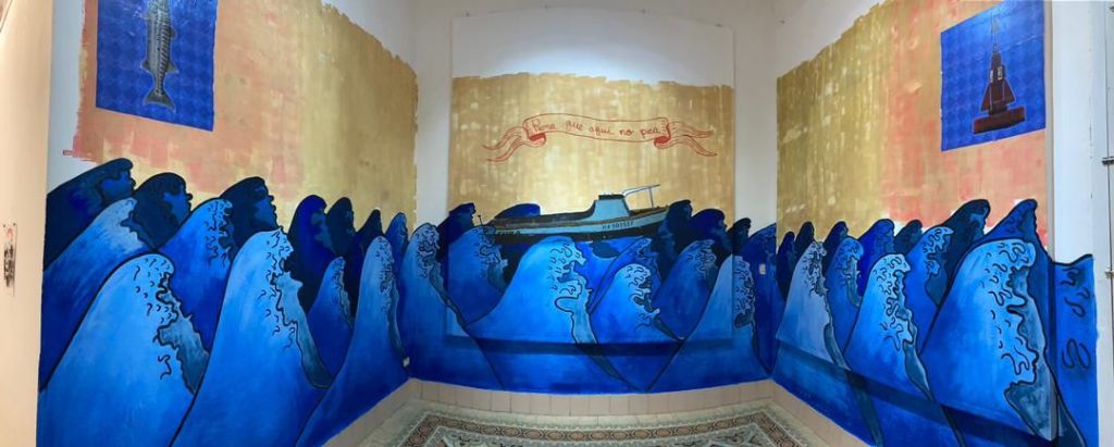 La pieza que remite a la icónica ola japonesa, junto con la frase «rema que aquí no pican», ofrece una conexión con el patrimonio cultural más amplio y una particular mirada a la idiosincrasia cubana. No obstante, esta transposición de la calle (donde originalmente fue emplazada) a la galería puede interpretarse como una suerte de domesticación del ímpetu contestatario del graffiti, que tradicionalmente desafía las normas y se impone en el paisaje urbano sin pedir permiso.