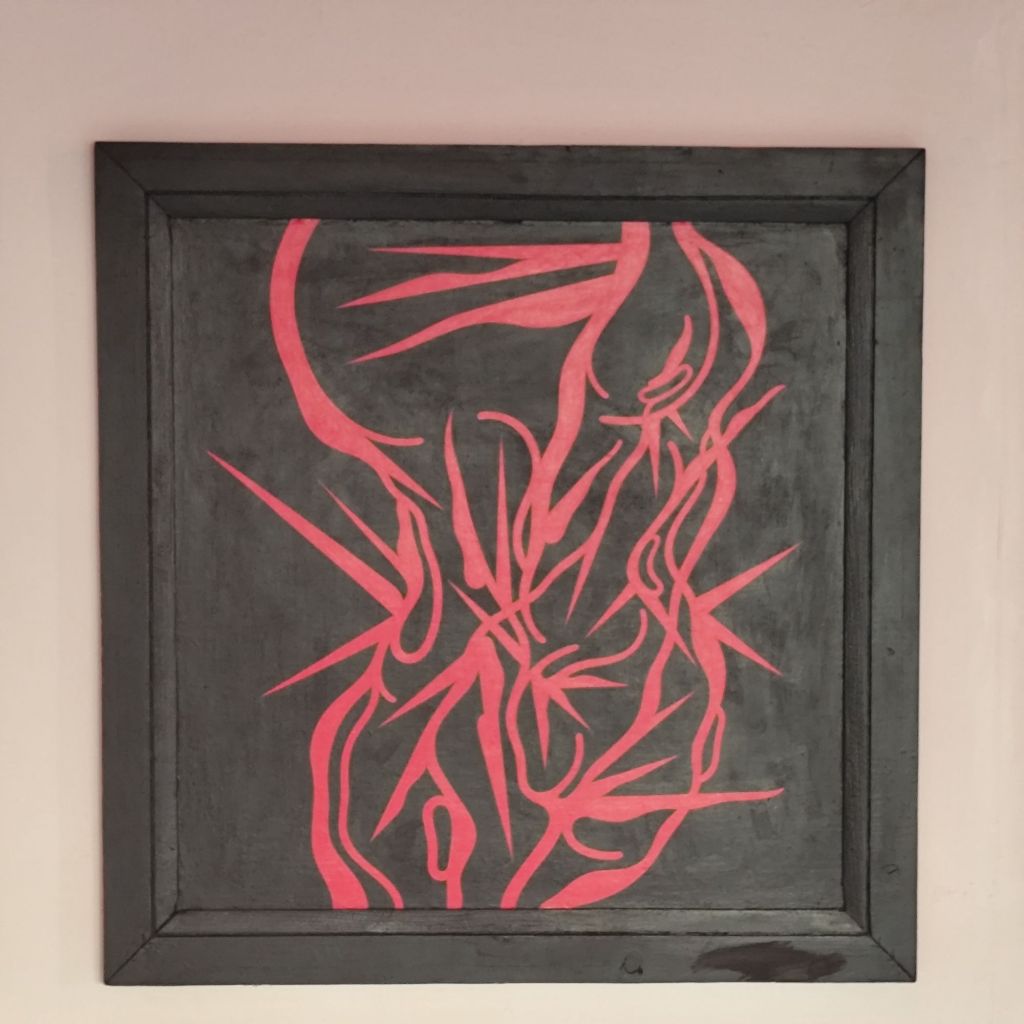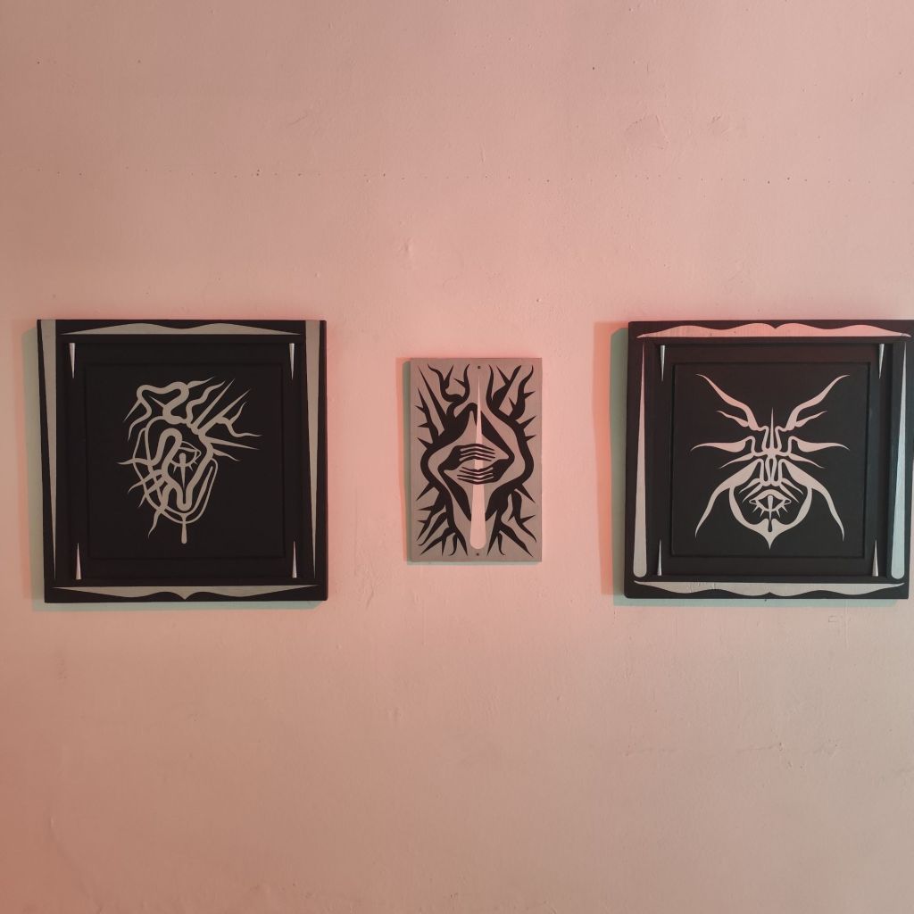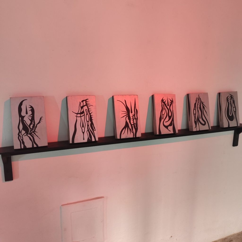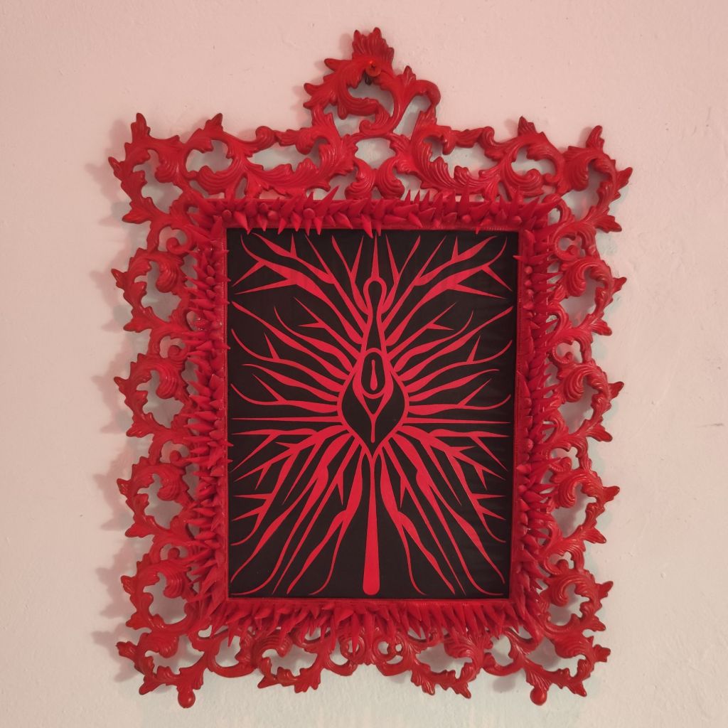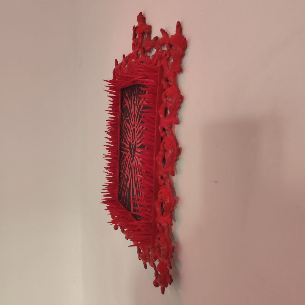 En la sala, la iluminación roja baña las obras, generando un ambiente que subraya la visceralidad del contenido. Cada pieza parece pulsar en una tensión constante entre la agresión y la introspección. Los marcos con espinas pronunciadas, por ejemplo, encapsulan los elementos centrales como si fueran fragmentos de un ritual de protección o defensa, evocando los sentimientos de amenaza y resistencia que atraviesan las experiencias de violencia.