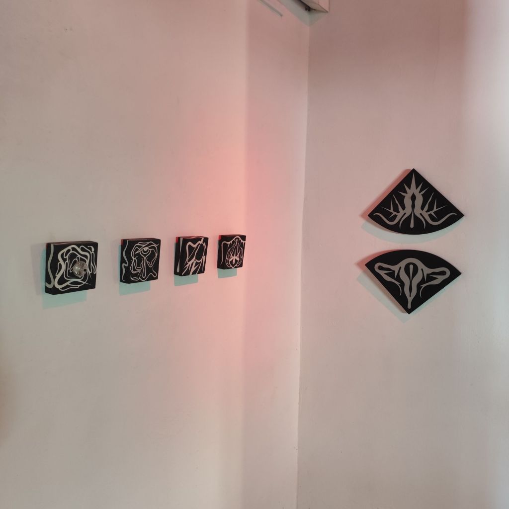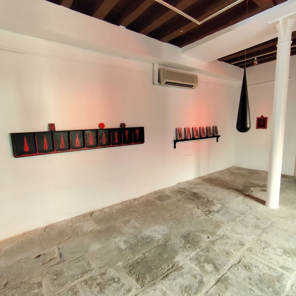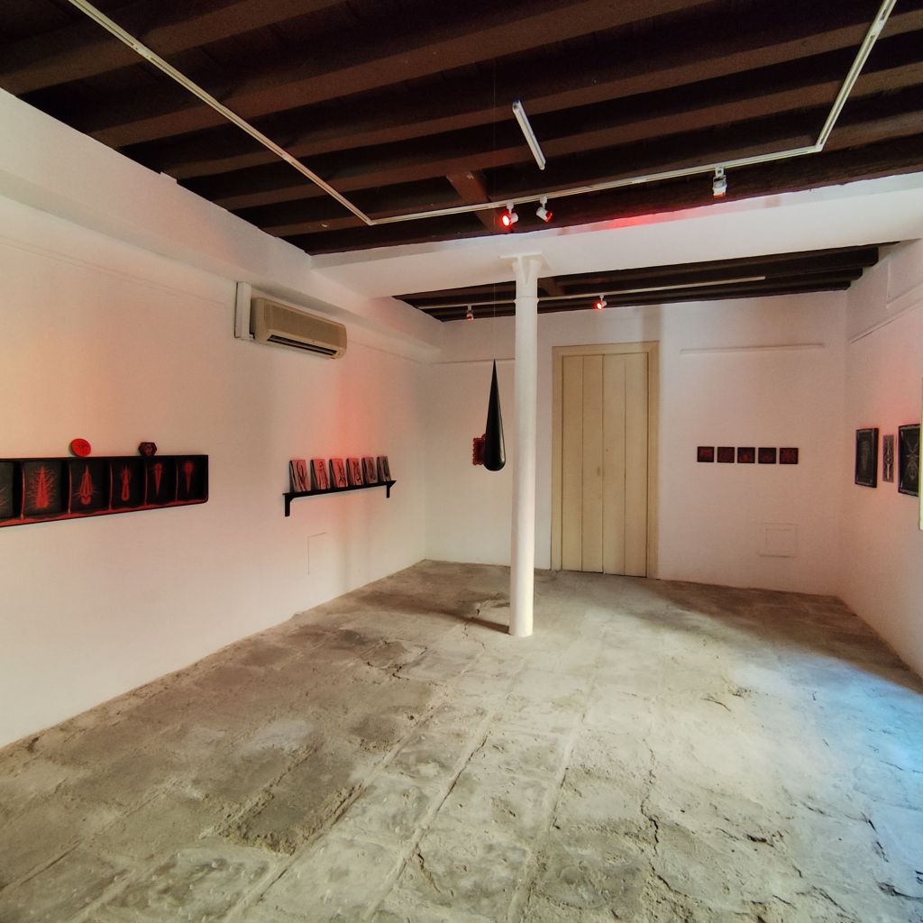 Las piezas, compuestas por formas orgánicas en rojo y negro, invocan imágenes de tejidos corporales, espinas, gotas y raíces, que se extienden y se retuercen en un espacio definido por una paleta cromática austera pero vibrante. El uso del rojo como color predominante no es casual; el rojo ha sido asociado históricamente con la sangre, la vida, la pasión y el dolor, y aquí se convierte en un vehículo para explorar las dimensiones más profundas de la violencia. La constante aparición de formas similares a ojos dentro de las composiciones sugiere una mirada interior, un testimonio silencioso pero contundente, alineado con la tradición del arte feminista que ha buscado hacer visible lo invisible, dar forma al trauma sin caer en el sensacionalismo de la violencia explícita.
