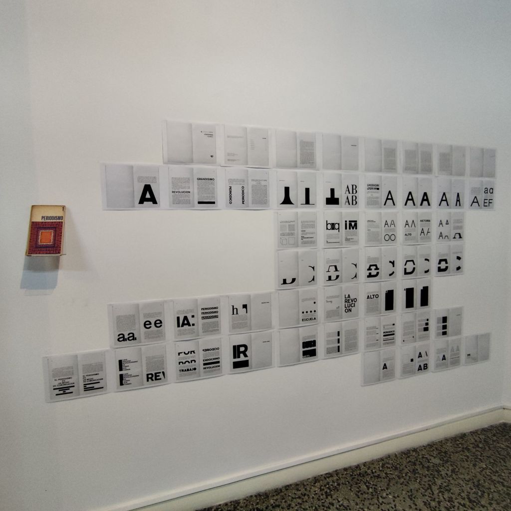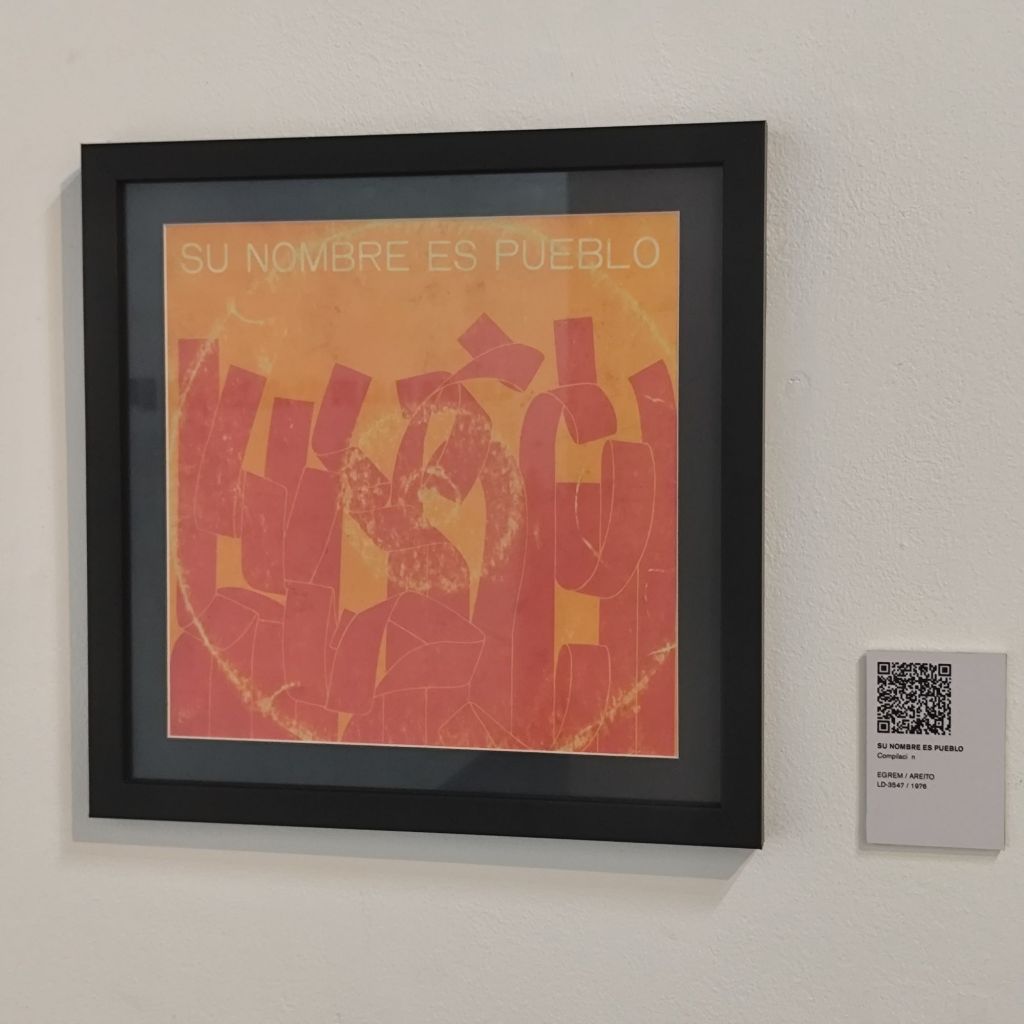 Un vistazo inicial a la primera sala, donde se exponen a varias alturas y en los mismos formatos, un centenar de carteles (incluso algunos repetidos), me hizo recordar un fragmento de una entrevista donde F. Beltrán afirmaba: «Los creadores de carteles, como en mi caso, enfrentamos con frecuencia ciertas dificultades como la iluminación, la distancia y la inclinación que altera la percepción del cartel». En cierto sentido, la ubicación de libros cuyas carátulas fueron diseñadas por este creador, situados en la pared sobre soportes inclinados, me hizo pensar en lo necesario que son los soportes especializados (expositores) para mostrar estos materiales gráficos en su ambiente natural. O cómo habría funcionado la música en la pieza dedicada al diseño de la carátula del disco «Su nombre es pueblo», más allá de redirigir a través de un código QR (beneficioso para los jóvenes, pero no para algunas generaciones).
