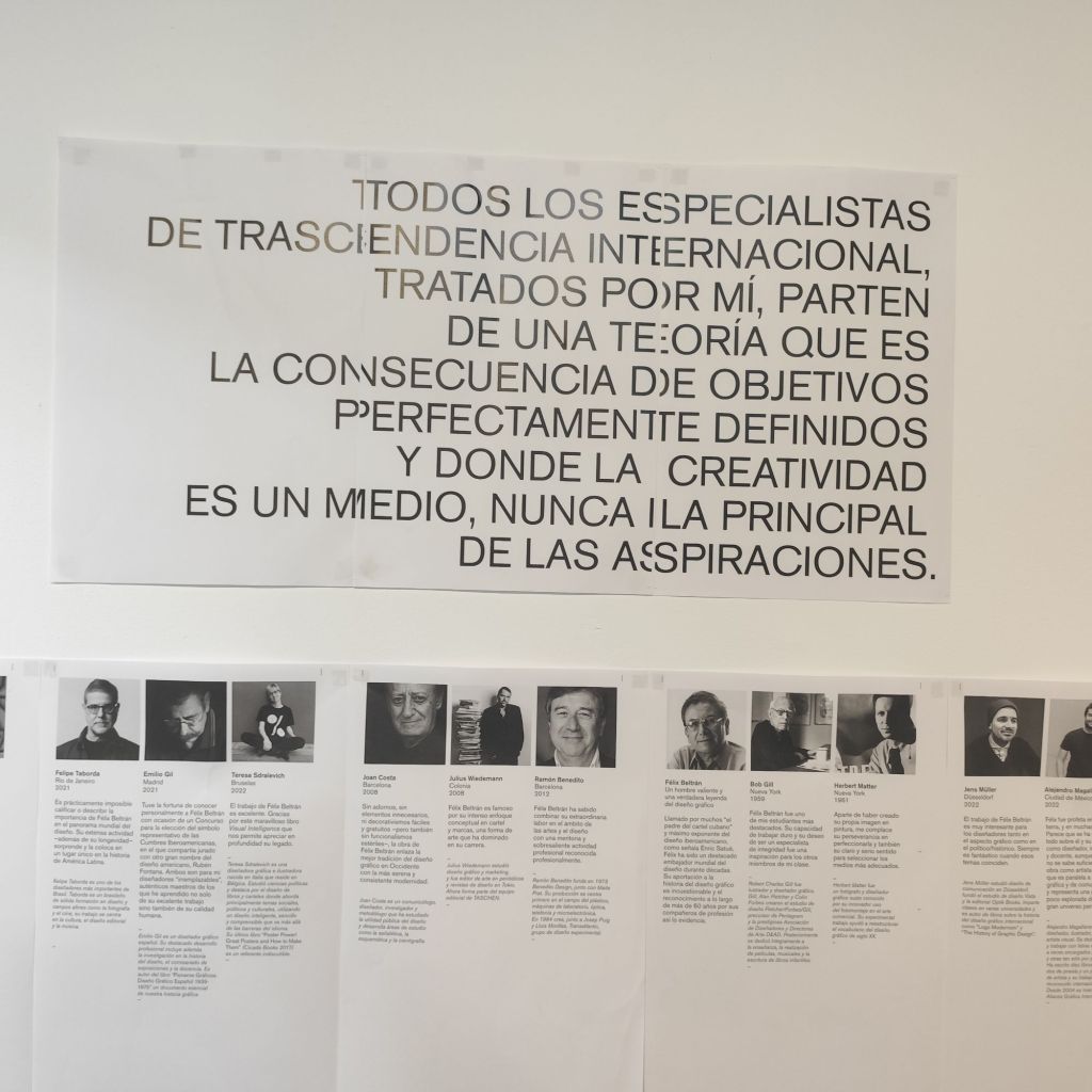 Esta exposición tiene su antecedente inmediato, y me atrevería a decir que reproduce mucho de los aspectos curatoriales y museográficos de la muestra Félix Beltrán, inteligencia visual. El diseño en sentido social, realizada el pasado año 2023 (enero – abril) en el Centro de Arte Complutense en Madrid. Fue esta la primera muestra antológica sobre el trabajo del diseñador, presentando cientos de sus logos, carteles y portadas de libros, y ofreció al público una visión profunda de la mente conceptual y creativa del diseñador gráfico iberoamericano más universal según reflejó la prensa especializada. La génesis y corpus teórico se encuentra en la investigación recogida en los libros Félix Beltrán Inteligencia Visual y Félix Beltrán Siempre el diseño de los autores Sonia Díaz y Gabriel Martínez, editados por Ediciones Complutense y Optik Books.