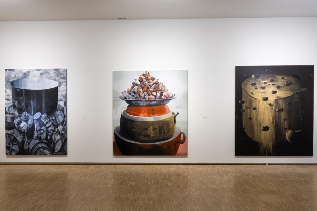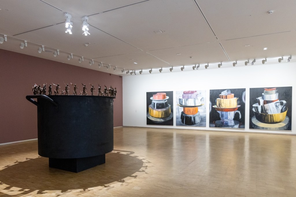 Asimismo, la repetición de ollas y sartenes con obras como La Torre, Desbordamientos, Levitación, Complacencias entre otras, apiladas como monumentos de lo cotidiano, señala el absurdo de una cultura de lo desechable y de la acumulación sin sentido. Fabelo transforma estos utensilios en símbolos de una narrativa poscolonial, donde los objetos asociados a la cotidianidad y la cultura popular se elevan al estatus de iconos. Esta elevación de lo doméstico y «común» a un espacio de dignidad artística rompe con las jerarquías tradicionales del arte y plantea una recuperación del valor simbólico de los objetos asociados a la cultura material de lo subalterno. Aquí, Fabelo articula una poética que, lejos de limitarse a la crítica social, devuelve la agencia a lo cotidiano, revalorizando las experiencias comunes como fundamentales para una narrativa de resistencia y deconstrucción frente a las imposiciones de un sistema globalizado que tiende a homogeneizar las identidades.