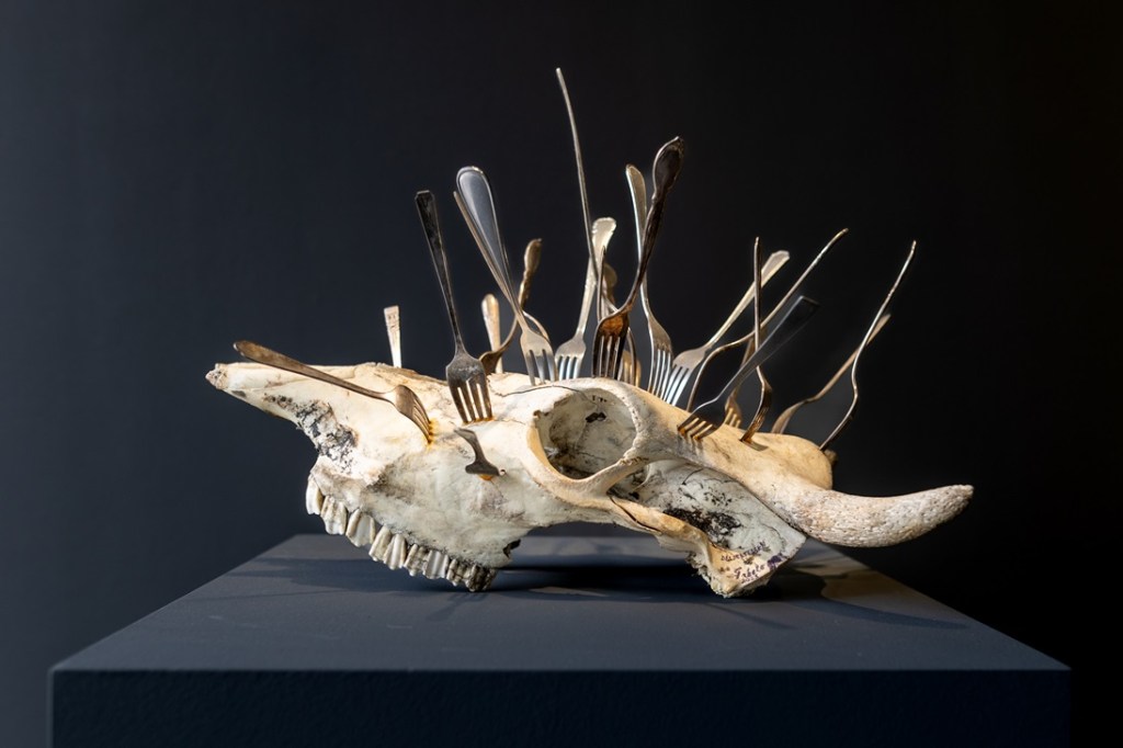 Por otra parte, Delicatessen -instalación de un cráneo animal coronado con tenedores- subraya la tensión entre la domesticidad y la violencia latente en el consumo, el poder y la dominación. La pieza se convierte en una suerte de «memento mori» contemporáneo, un recordatorio de los restos y residuos que dejan las estructuras de poder y la sobreexplotación. Esta obra puede interpretarse, en términos de la teoría de “darle la vuelta al mapa”, como una crítica a la relación entre los países centrales y periféricos, donde los recursos naturales y humanos de los «territorios otros» han sido sistemáticamente devorados por la lógica extractivista del capitalismo. En este sentido, Fabelo no solo denuncia, sino que invita a reflexionar sobre las huellas indelebles del colonialismo en las prácticas de consumo contemporáneo, exponiendo la continuidad de esas dinámicas coloniales bajo nuevas formas de opresión.
