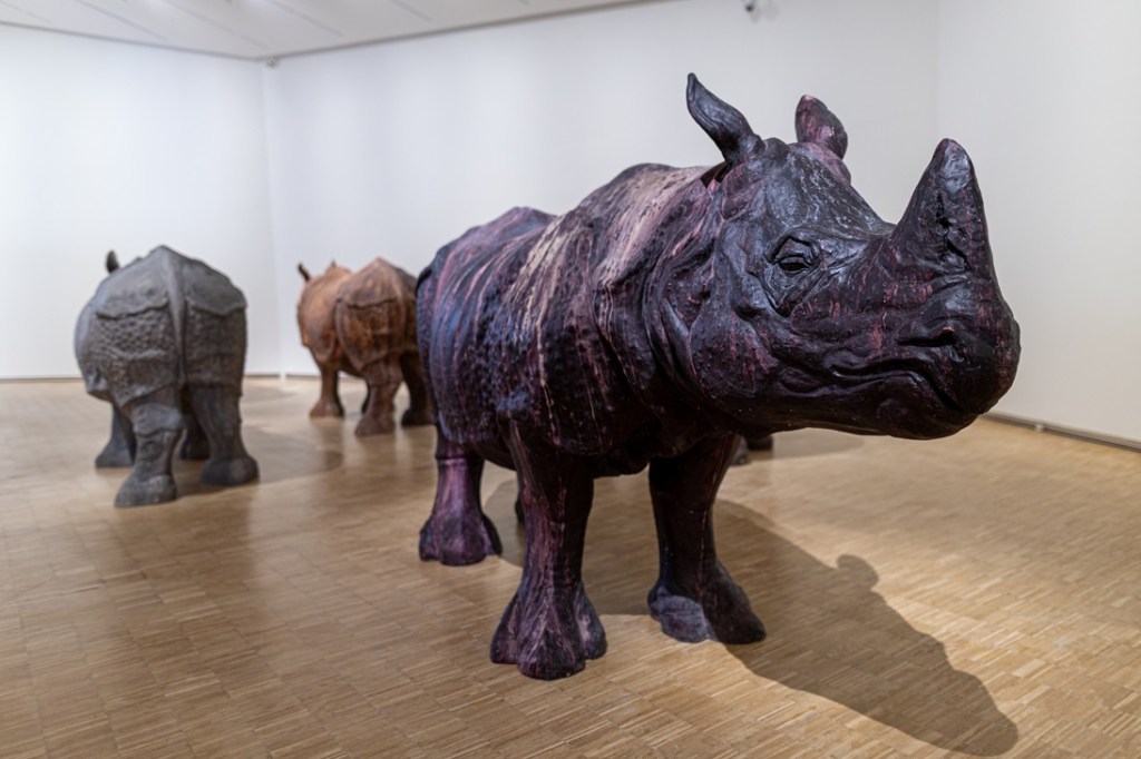 En la pieza de los rinocerontes, Fabelo despliega una fila de animales monumentales, dotados de una presencia imponente que combina dureza y vulnerabilidad. Uno de los rinocerontes lleva un lazo rojo, cuyo color vibrante contrasta de forma irónica con la solidez de su anatomía, sugiriendo una contradicción entre lo salvaje y lo ornamental, entre lo indomable y lo apropiado. Este toque decorativo, aparentemente trivial, introduce un componente absurdo que resalta la paradoja de la domesticación simbólica de lo natural. Los rinocerontes, símbolos de fortaleza y resistencia, avanzan en una procesión lenta, como si encarnaran una narrativa de supervivencia y resistencia ante la amenaza de la extinción y la explotación. Con esta obra, Fabelo cuestiona no solo la relación de explotación que el ser humano mantiene con la naturaleza, sino también la manera en que estetizamos y cosificamos a otros seres vivos, imponiéndoles un valor simbólico que obedece a nuestras lógicas extractivistas y de consumo.