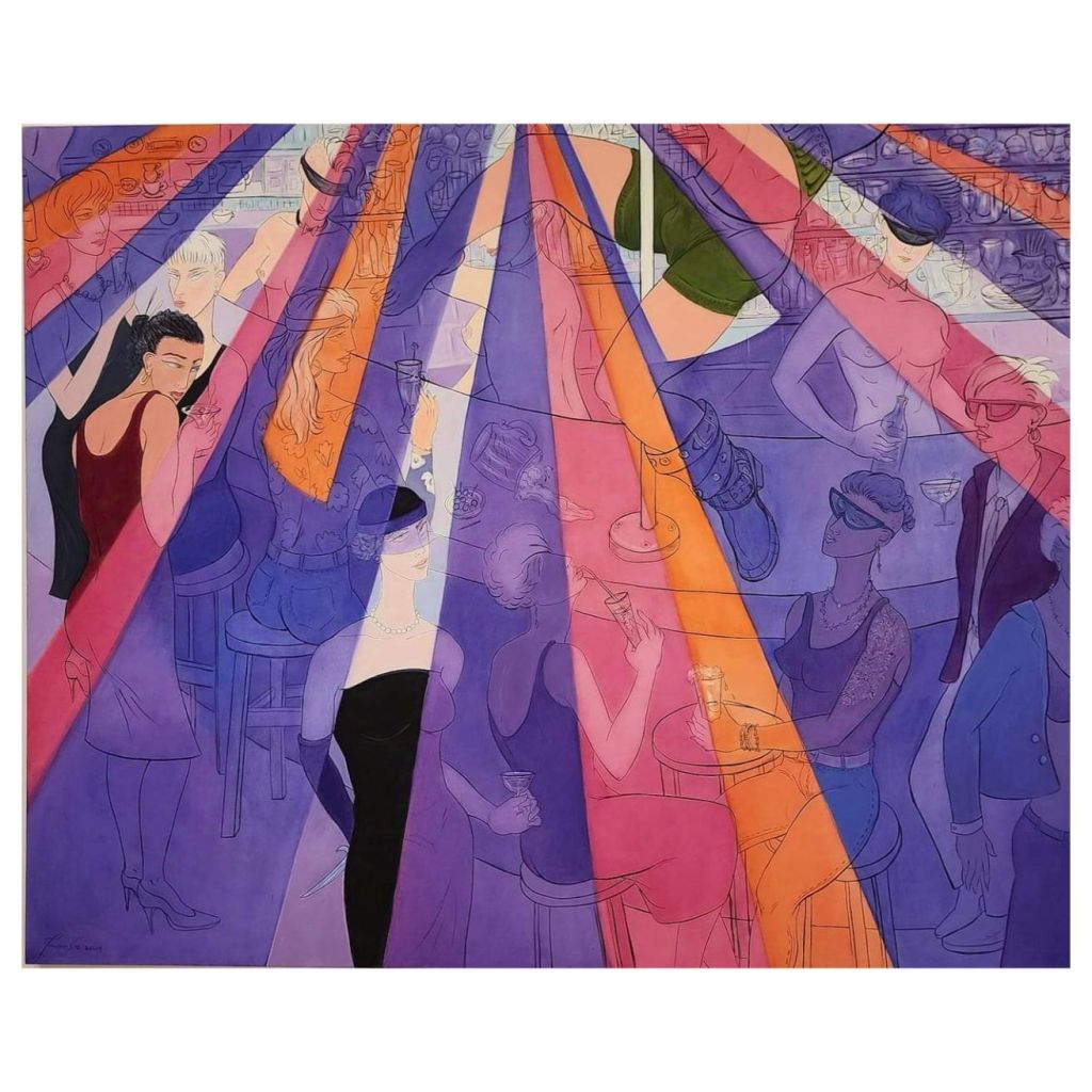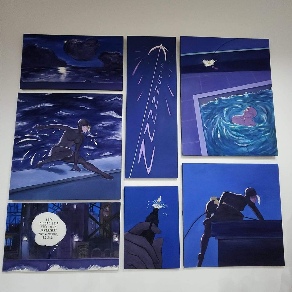 En términos formales, la estética de Rocío opera con una economía de medios que no desatiende el detalle narrativo. Su uso del color —particularmente los tonos púrpuras y azules que dominan esta exposición— construye un espacio cromático que refuerza la atmósfera de alucinación y ambigüedad. La saturación tonal, lejos de ser un recurso decorativo, se convierte en un lenguaje propio que encapsula el malestar, la ansiedad y la fragmentación que subyacen a su discurso pictórico. El púrpura, como color asociado al poder y al exceso, aquí es resignificado como un código de resistencia frente a las lógicas normativas.