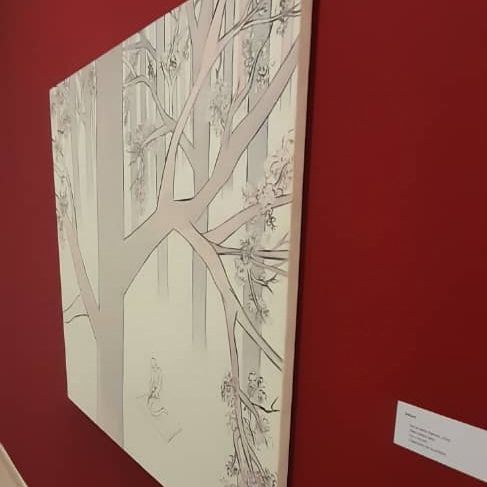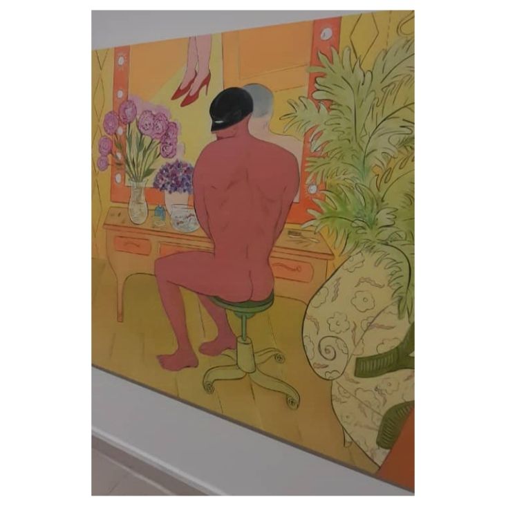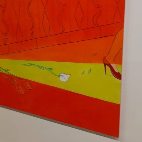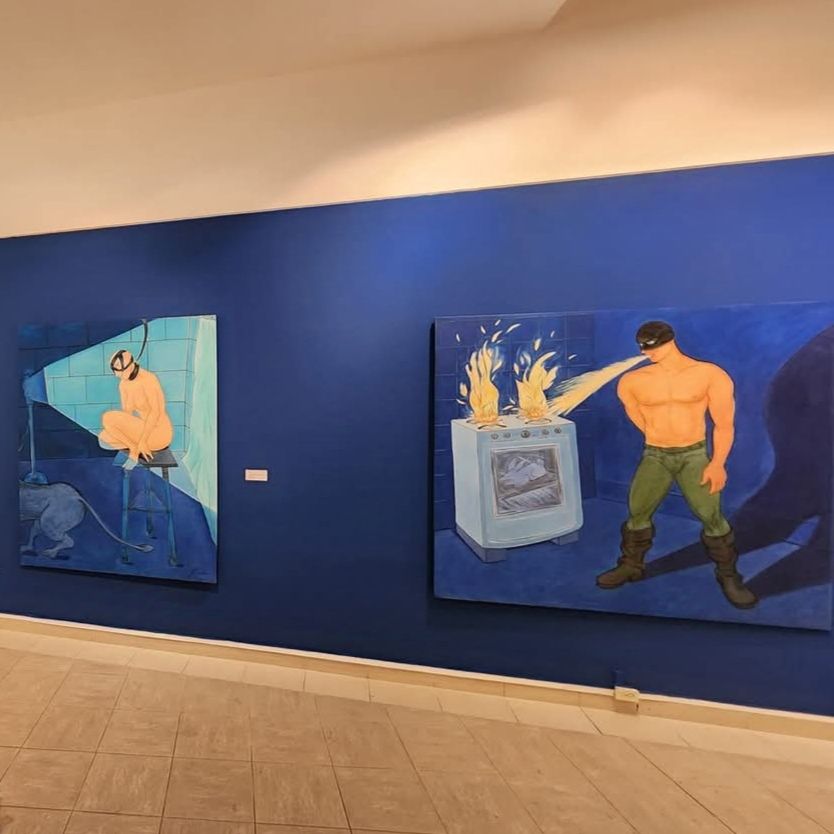 Un elemento que merece atención en esta muestra es el montaje curatorial, que consigue potenciar la narrativa al presentar las piezas en un diálogo constante y orgánico. Las composiciones de gran formato, dispuestas contra fondos monocromáticos, subrayan la monumentalidad del delirio como un espacio expansivo que el espectador no puede evitar habitar. Esta decisión curatorial no busca neutralizar la carga emocional de las piezas, sino intensificarla, creando una experiencia inmersiva que desafía los límites entre la obra y el espacio expositivo.