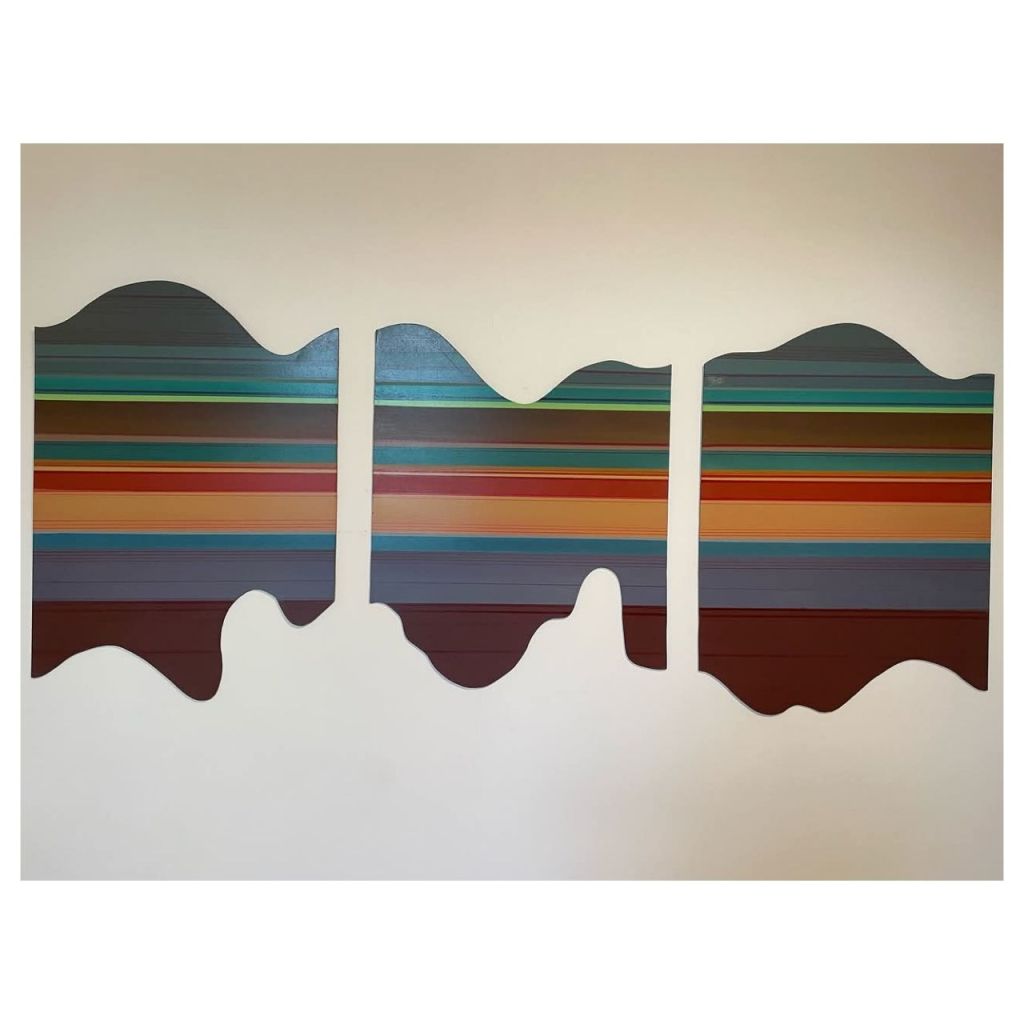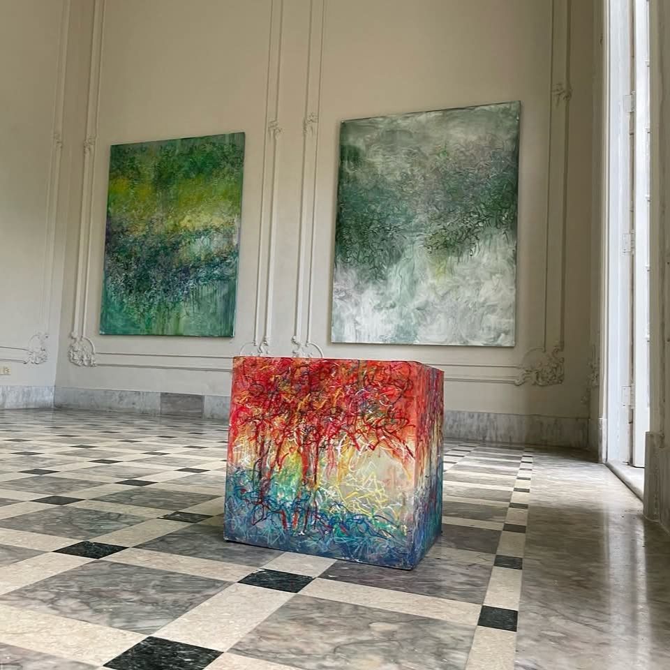 Por último, Alejandro Jurado presenta una obra que juega con la fragmentación del lienzo, proponiendo una pintura que se despliega como un mapa. En sus piezas, el color se convierte en un protagonista casi táctil, y la superficie del lienzo se fractura en múltiples planos que sugieren una relación con el espacio. Pero, estas fracturas permanecen en el ámbito visual, sin llegar a interactuar físicamente con el espacio o a implicar al espectador de manera inmersiva excepto en alguna obra tridimensional ubicada en el espacio expositivo en forma de cubo intervenido en sus caras. Como en el caso de Kike (Enrique Cabrera), la obra de Alejandro parece detenerse en la frontera de esa pintura expandida, donde los límites formales se cuestionan, pero el espacio conceptual no se reconfigura.