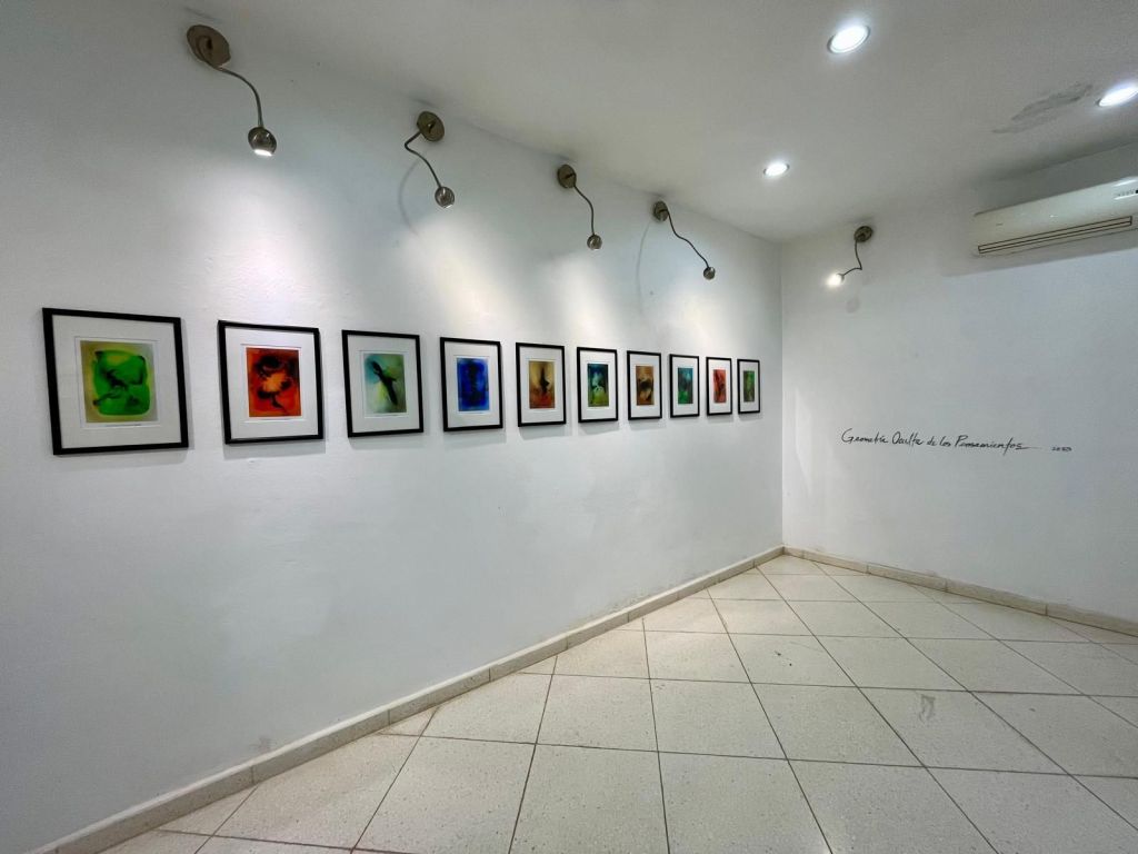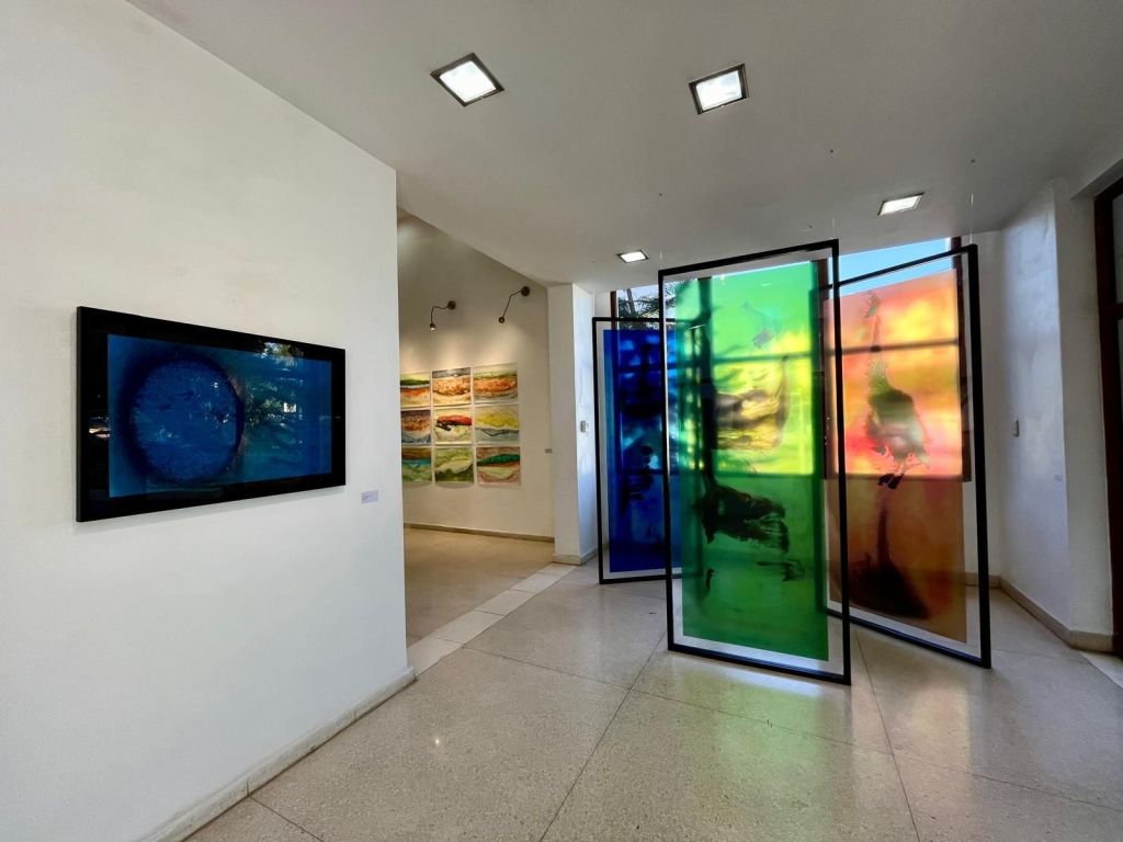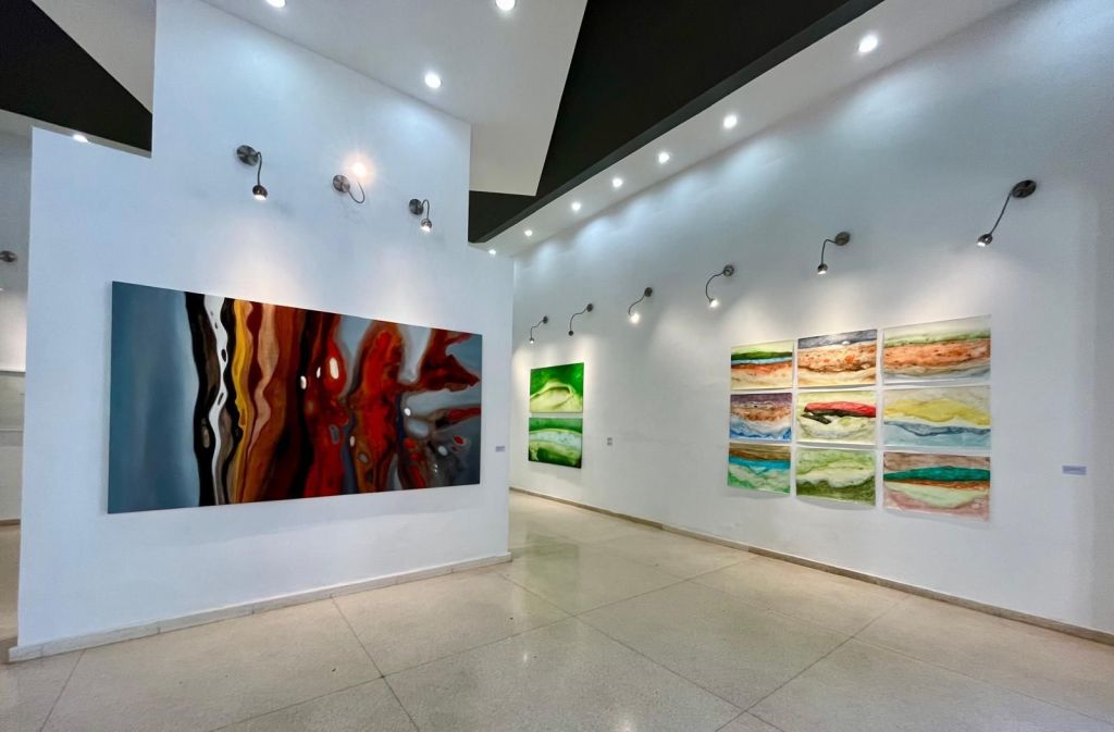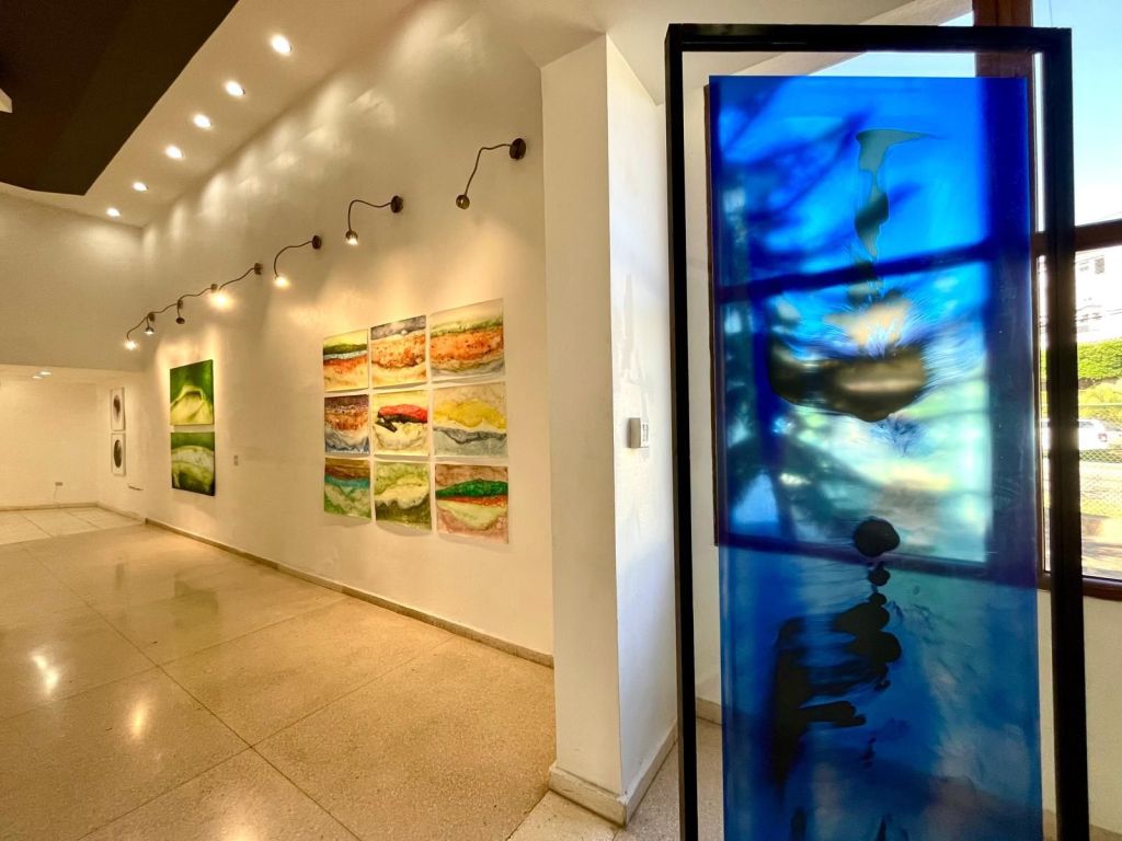 El espacio expositivo de Artis 718 refuerza esta dialéctica. Los paneles translúcidos colocados en la entrada funcionan como filtros visuales que modifican la percepción del entorno, generando una experiencia que no es fija, sino que varía según la posición del espectador. Este recurso no es menor: obliga a considerar la pintura en términos espaciales y no solo en su dimensión bidimensional. La luz, en este contexto, no es un elemento neutro; es un agente que interviene activamente en la construcción de la imagen. Las piezas en acrílico teñido funcionan casi como membranas líquidas, como organismos que absorben y refractan la luminosidad, provocando una oscilación continua entre presencia y disolución.