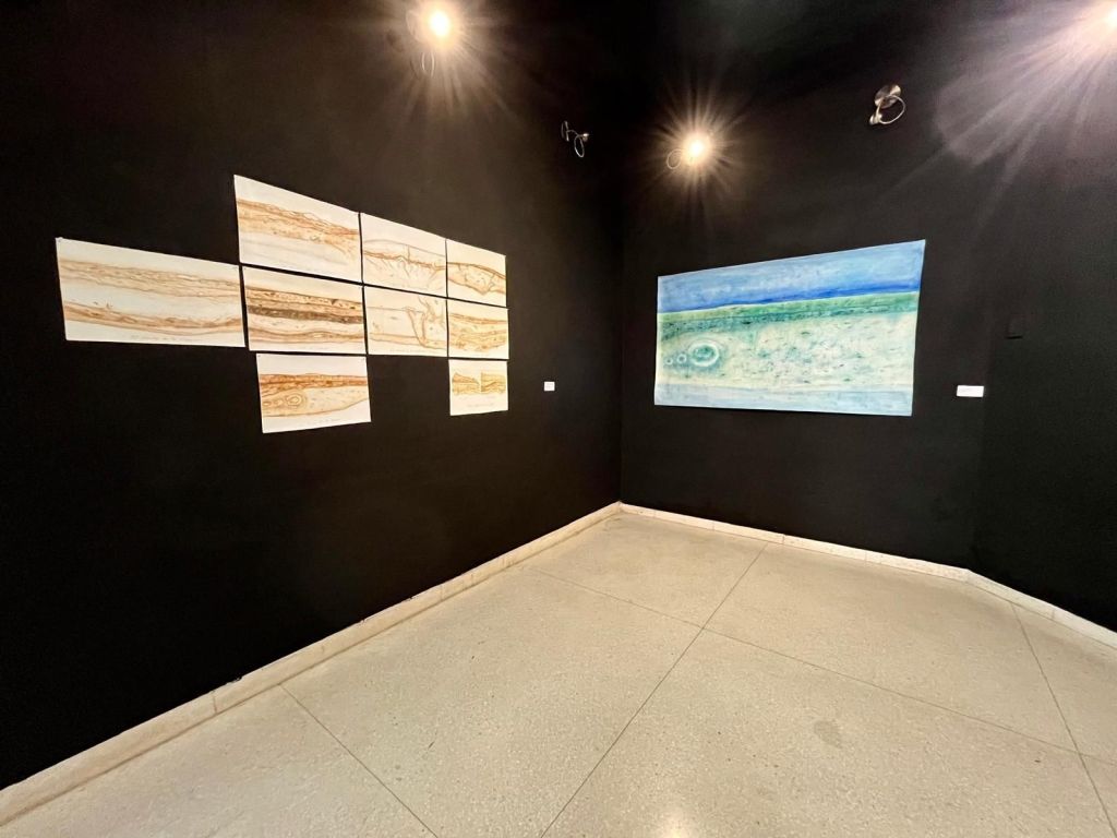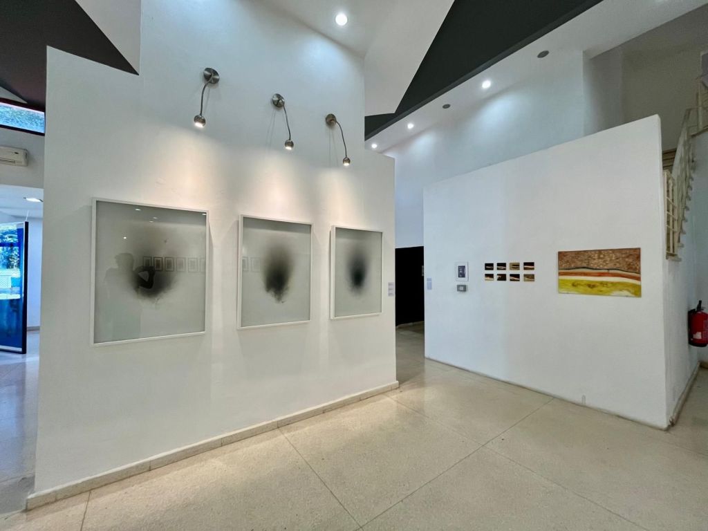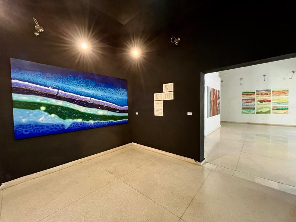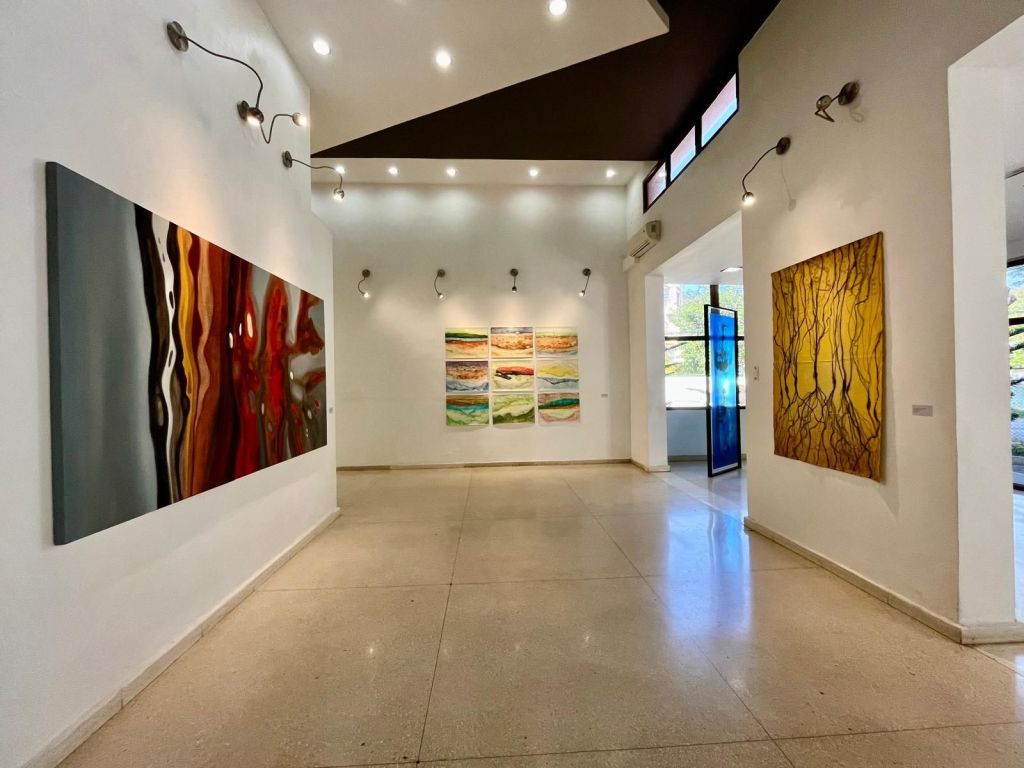 El espacio expositivo de Artis 718 refuerza esta dialéctica. Los paneles translúcidos colocados en la entrada funcionan como filtros visuales que modifican la percepción del entorno, generando una experiencia que no es fija, sino que varía según la posición del espectador. Este recurso no es menor: obliga a considerar la pintura en términos espaciales y no solo en su dimensión bidimensional. La luz, en este contexto, no es un elemento neutro; es un agente que interviene activamente en la construcción de la imagen. Las piezas en acrílico teñido funcionan casi como membranas líquidas, como organismos que absorben y refractan la luminosidad, provocando una oscilación continua entre presencia y disolución.