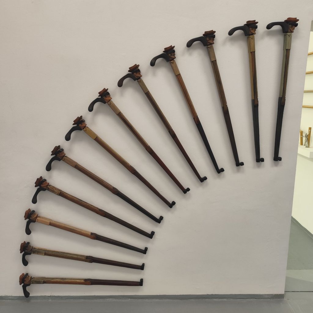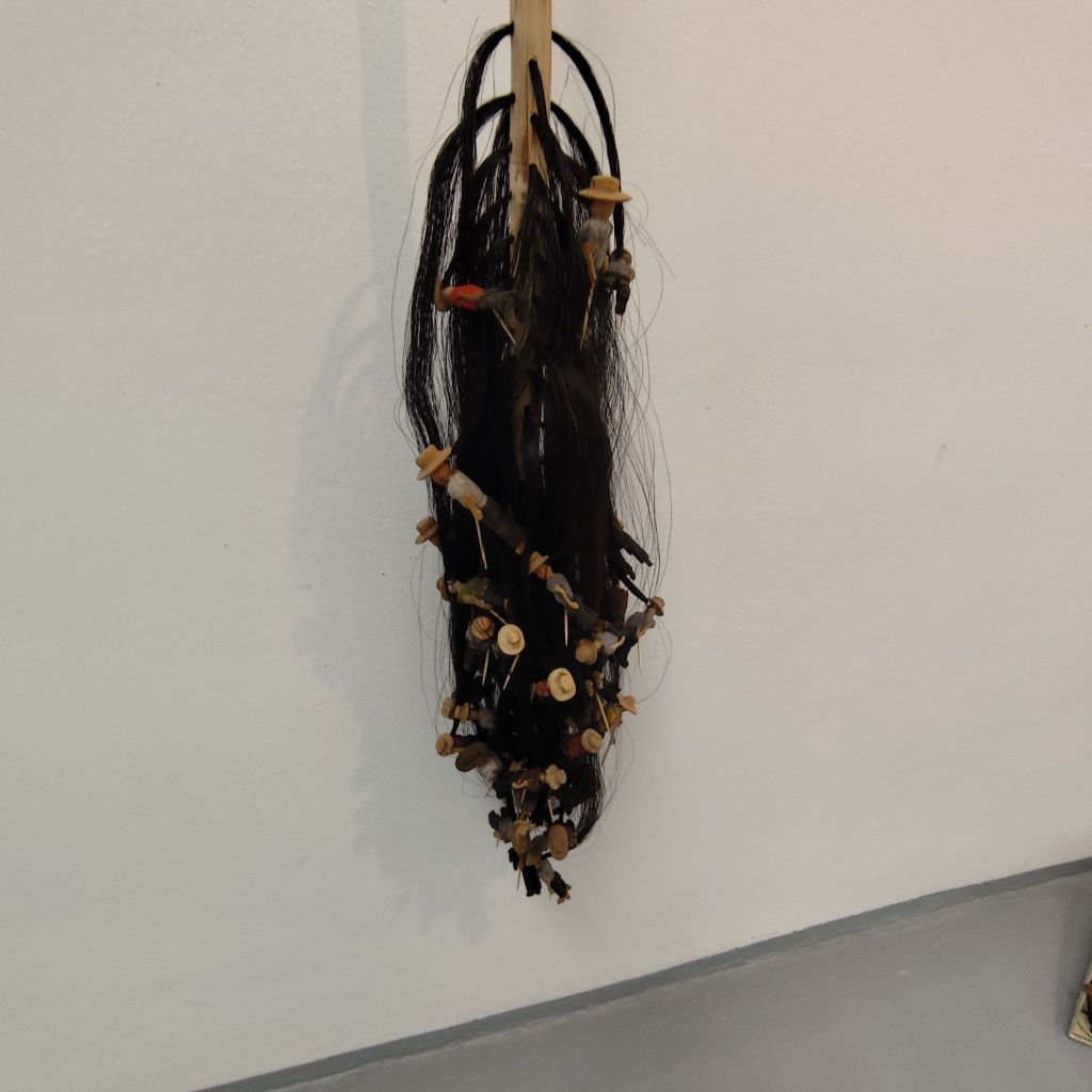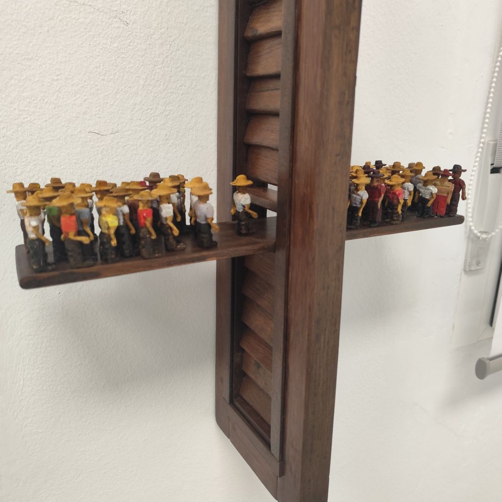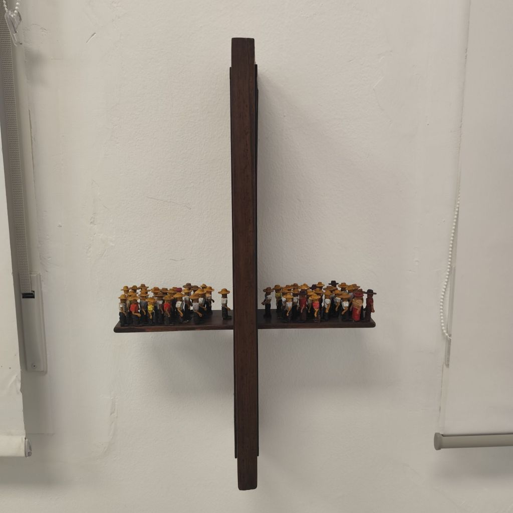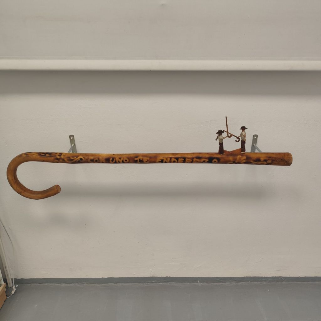 Más allá de la exclusión, Fernando nos habla de la violencia como espectáculo. En el bastón horizontal, dos figuras iguales se enfrentan con bastones como palos. La violencia no viene de arriba, sino de adentro. ¿Cuántas veces ha sido más fácil hacer del otro el enemigo antes que cuestionar el orden que obliga al enfrentamiento? ¿Cuánto de esta ira es propia y cuánto ha sido diseñada para mantener intacto el equilibrio de los de siempre?