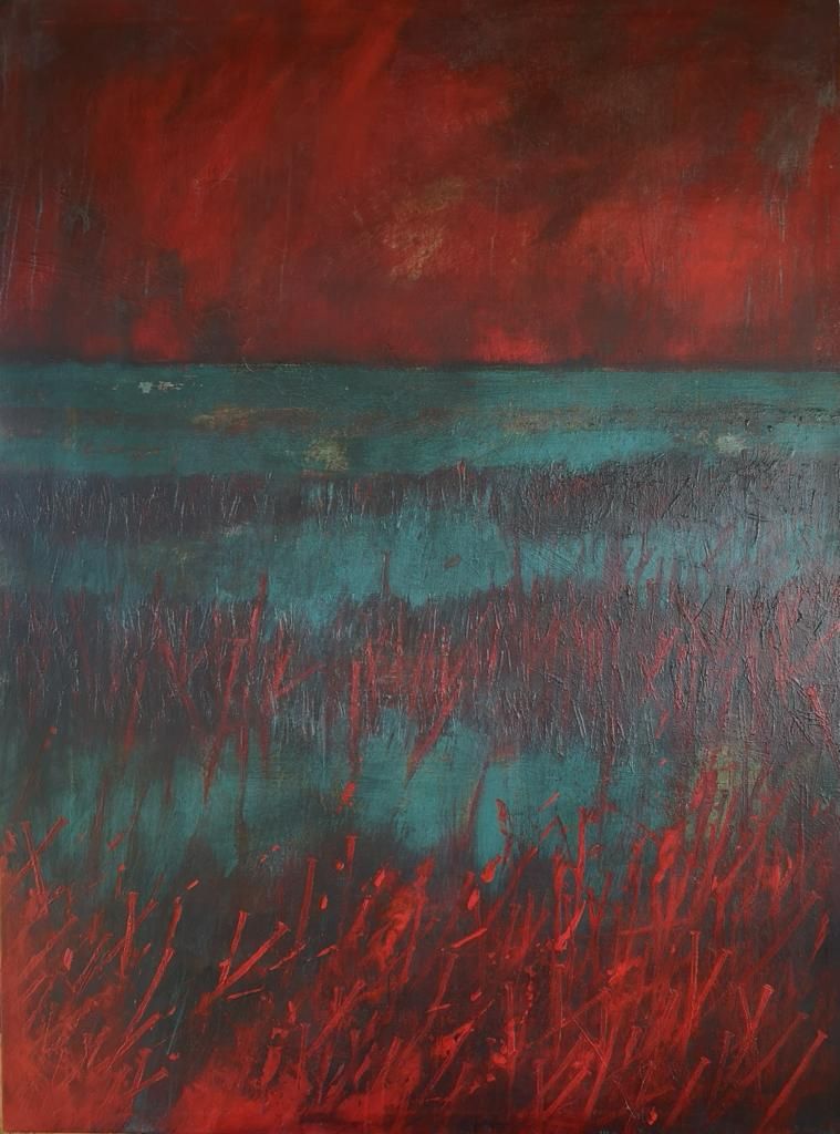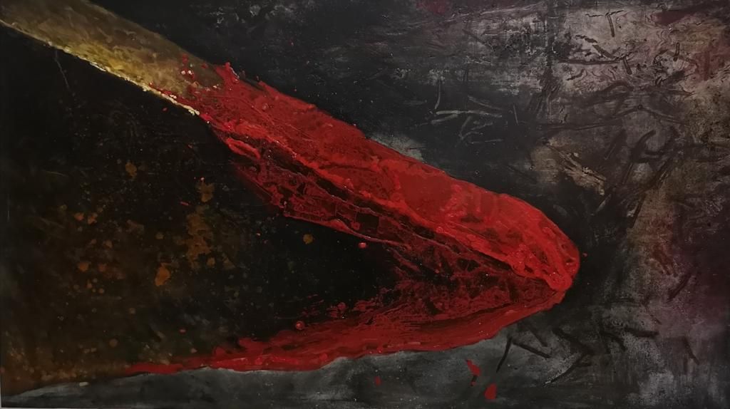 Marcos trabaja con la pintura como si esta, aún tuviera algo por decir en un tiempo que parece haberla relegado a lo ornamental. La suya no ilustra: invoca. No ordena: desborda. Si la alquimia proponía la transmutación de los metales en oro, aquí la materia se transfigura en signos vitales. El rojo —protagonista absoluto— no se impone como un recurso efectista, sino como principio generativo: sangre, lava, carne, flor, herida, todo en uno. Es una pintura que late.