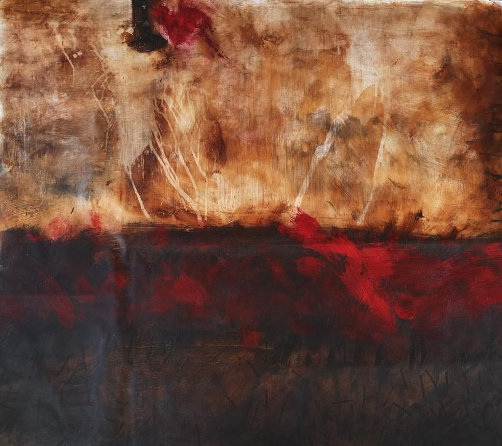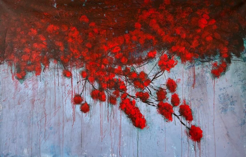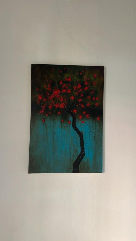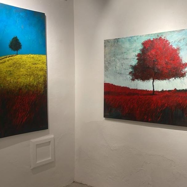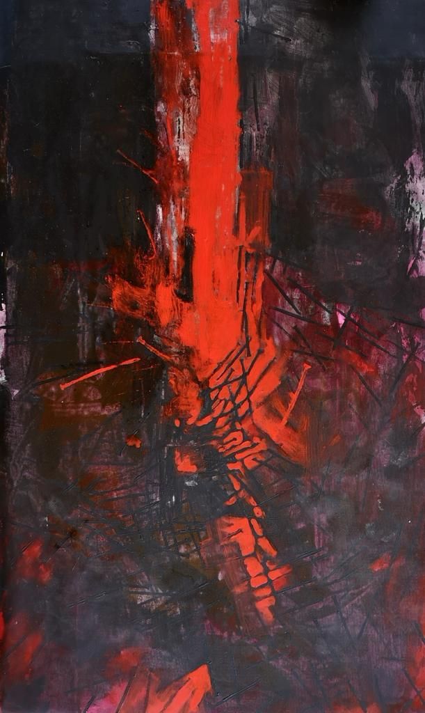 Las obras iniciales de la muestra, densas y telúricas, plantean una pintura que parece erigirse desde lo sísmico. El soporte es campo de batalla, altar, reliquia. Luego, sin abandonar la tensión, la exposición se abre a una suerte de lirismo contenido: los árboles emergen como tótems, no como paisajes. La pieza central —un árbol rojo sobre fondo blanco-azulado— no busca representar, sino condensar. Es una visión después del fuego, un canto al arraigo tras el caos.