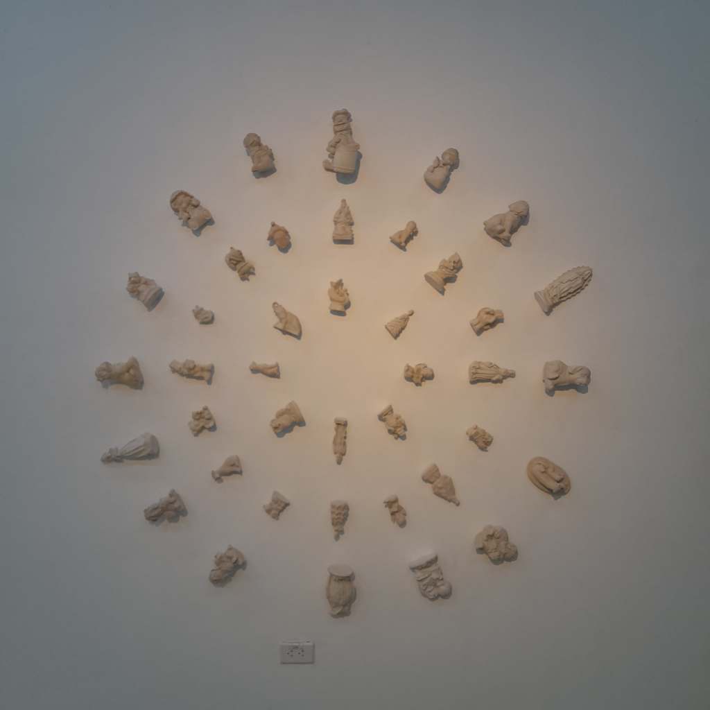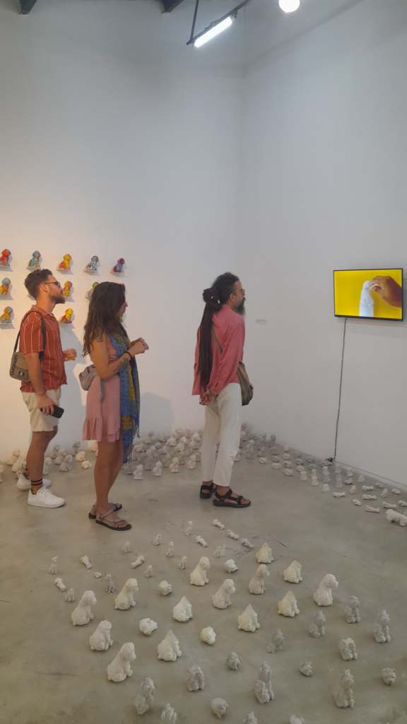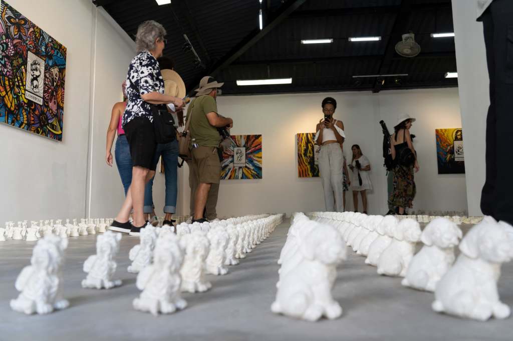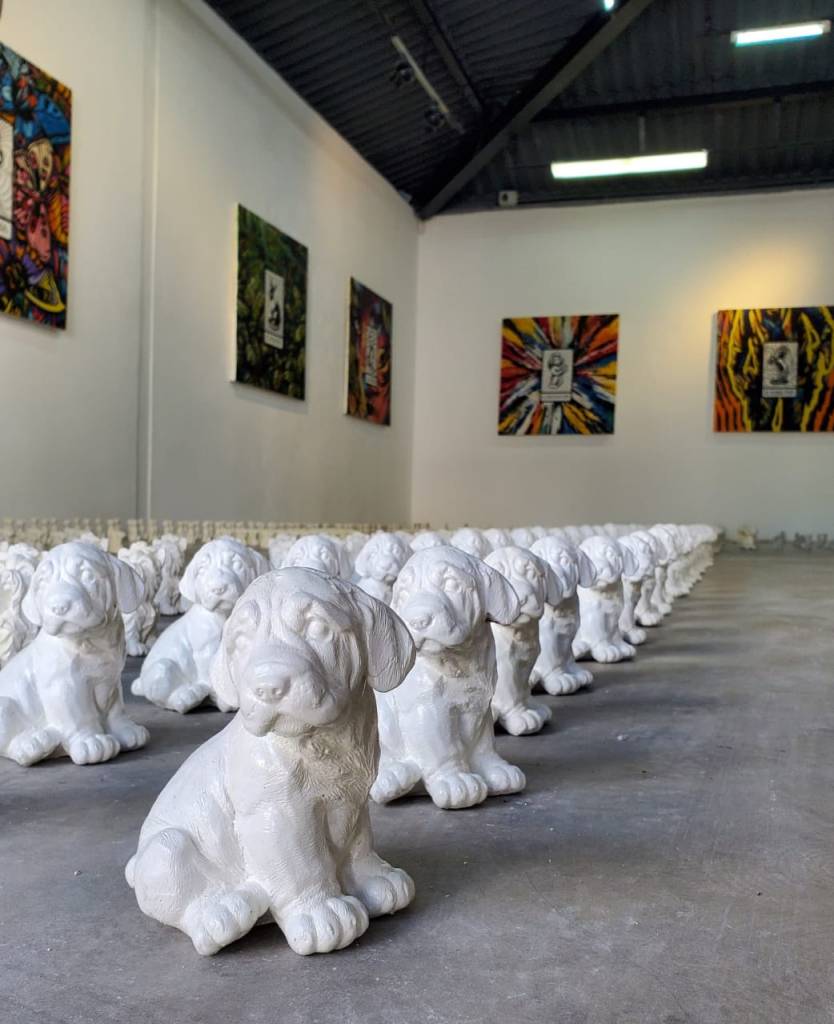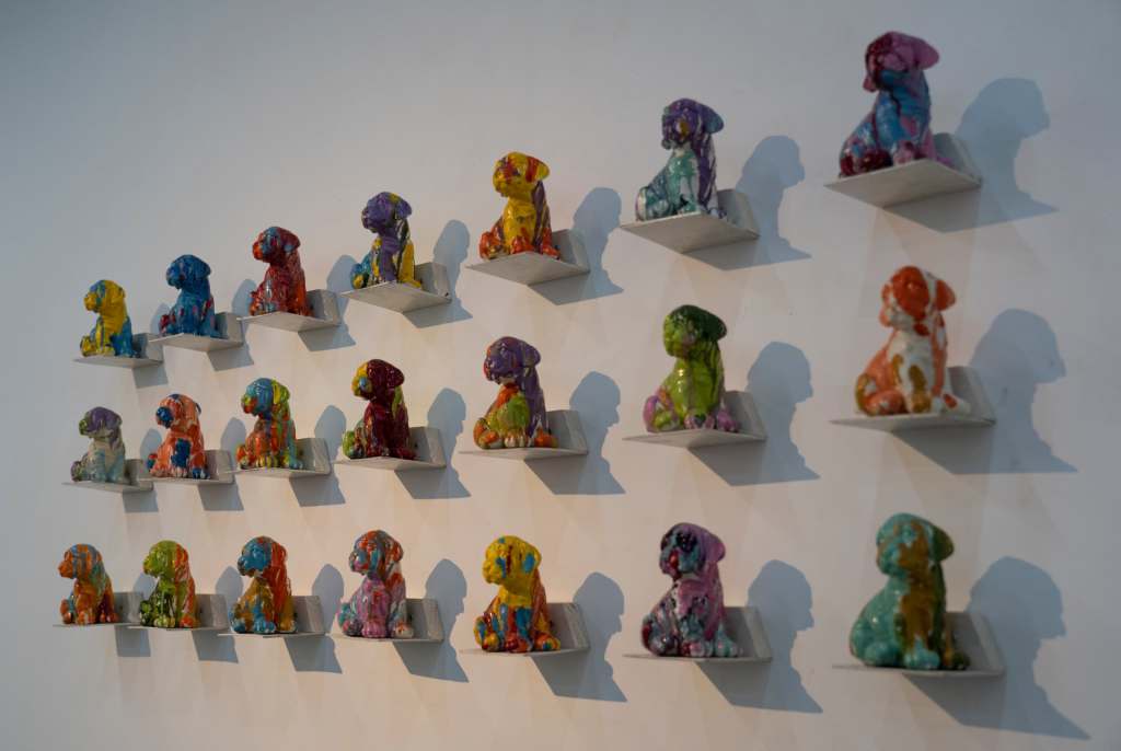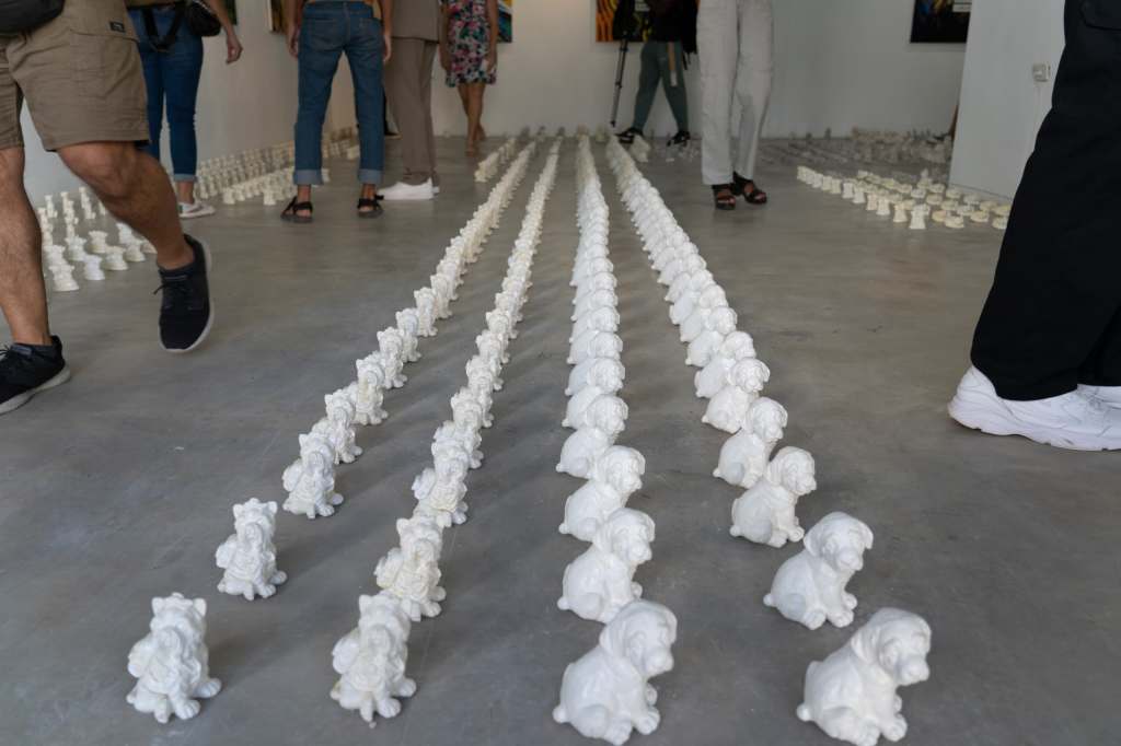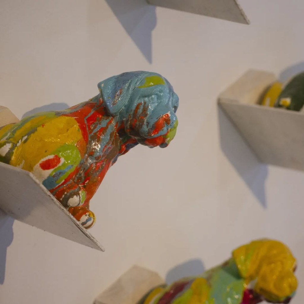 Es inevitable pensar en Jeff Koons —y no por casualidad aparece citado en el texto de sala. Su Puppy parece resonar en los perritos blancos que Pozo dispersa por el suelo. Pero mientras Koons eleva su obra al pedestal del espectáculo, Pozo baja a sus canes al nivel del polvo, los deja vagar como fragmentos emocionales de un mundo saturado de imágenes. No hay épica en esos perritos. Lo que hay es ternura y también cierta tristeza. Como si fuesen los restos dulces de un naufragio doméstico.