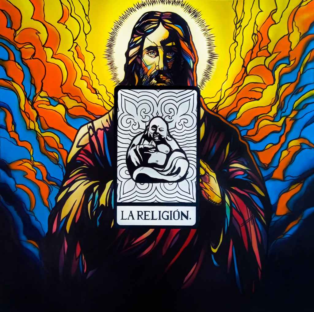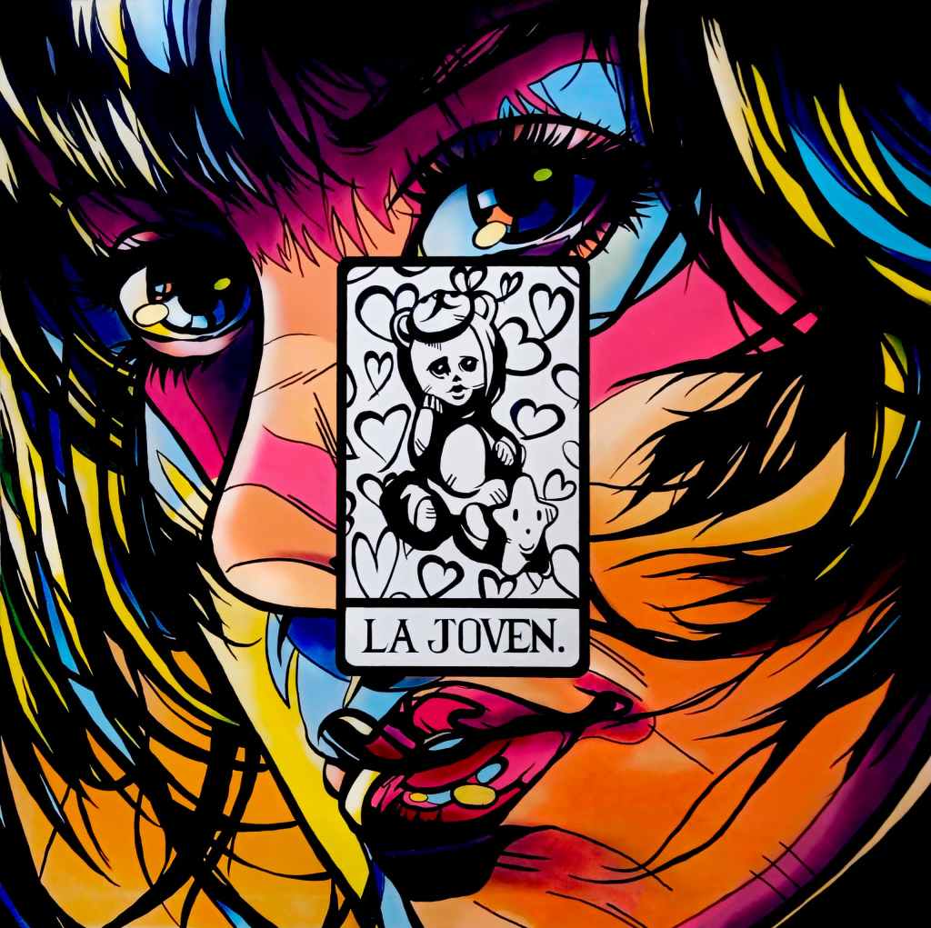 La exposición, presentada en La Nave de Genesis Galerías de Arte, se articula como un tarot muy personal. Cada obra es como una carta que revela algo íntimo, algo simbólico: La Flor, La Religión, El Icono Pop, La Abstracción… En muchas de estas piezas, los personajes en blanco y negro se recortan contra fondos intensamente coloridos, como si quisieran decir: “Mírame, pero no te conformes con lo que ves”. Y eso, justamente, es lo que logra Damián: hace que lo superficial no sea sinónimo de vacío.