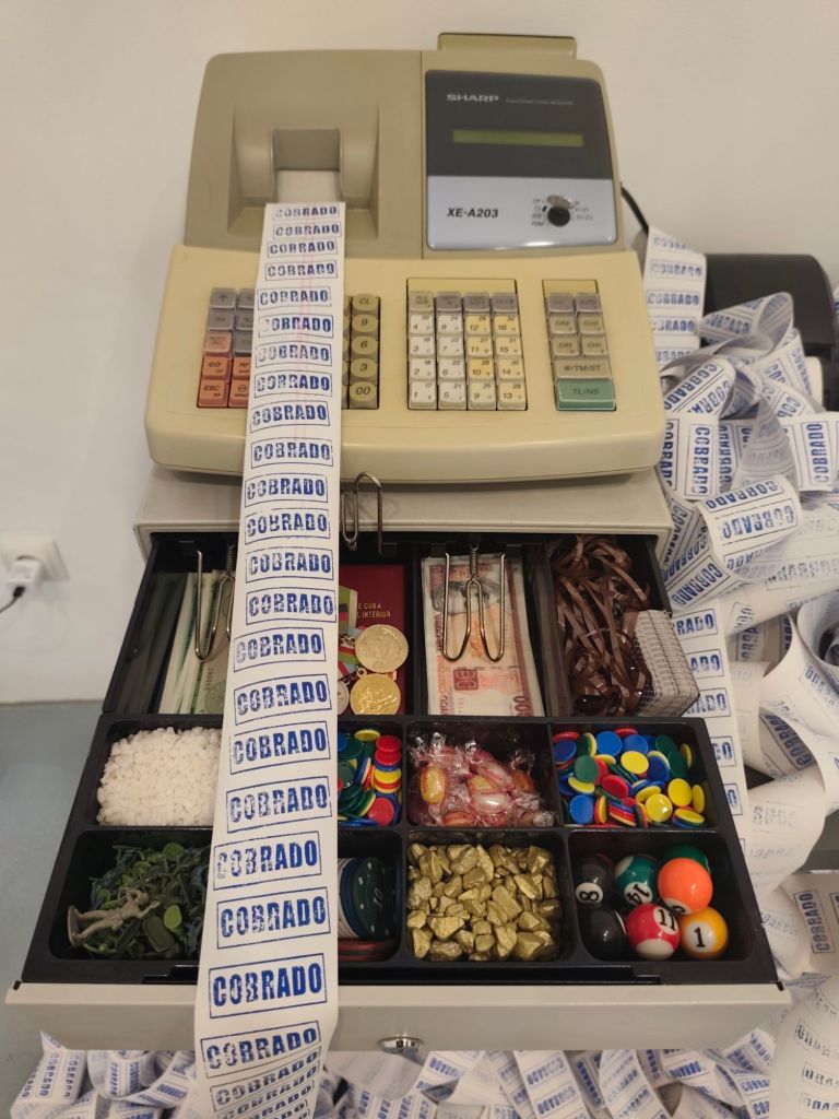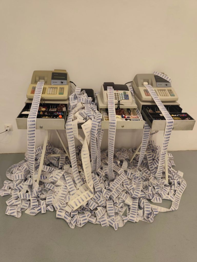 El punto de inflexión lo marca una de las instalaciones más potentes de Lorena Gutiérrez Camejo: una tríada de cajas registradoras que emiten incesantemente rollos de papel donde la única palabra que se imprime es “COBRADO”. No hay matiz, no hay pausa. Todo ha sido cobrado: la fruta, el cuerpo, el deseo, la nostalgia. La operación es sencilla, pero feroz. Las cajas no acumulan billetes: escupen símbolos inútiles, residuos de valor falsificado —caramelos vencidos, fichas de casino, piedras doradas sin peso—, en un gesto que subvierte la promesa de la mercancía como portadora de sentido. En lugar de tesoro, basura contable. La economía, aquí, se presenta como teatro absurdo: todo se cobra, pero nada vale.