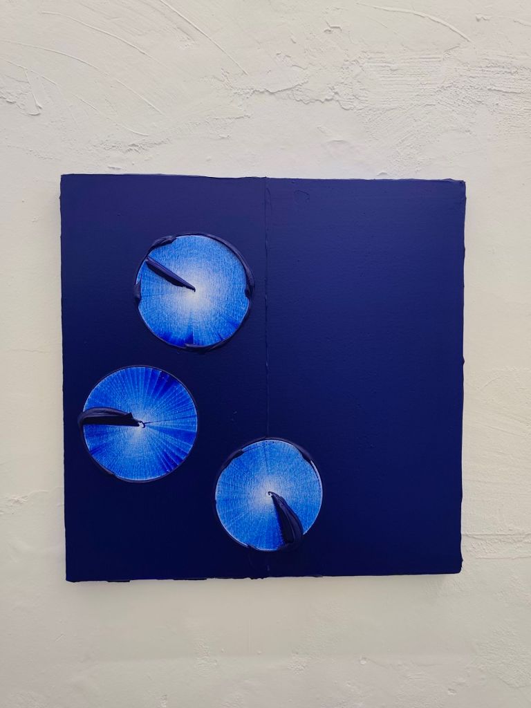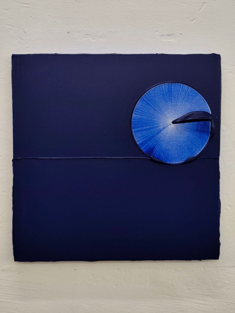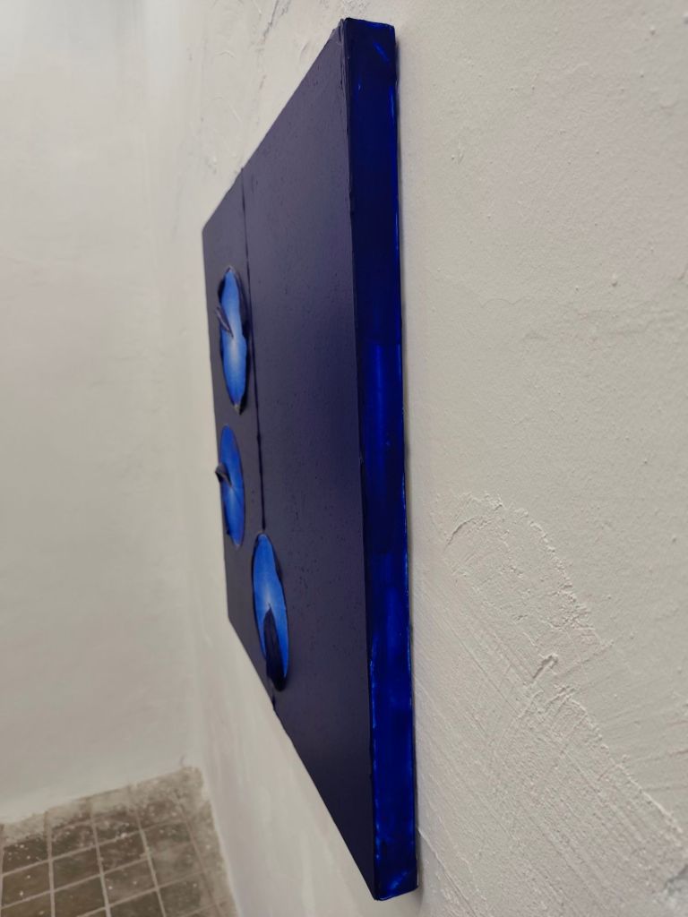 Hay algo perturbador —casi irrespetuoso— en esos cortes circulares, en esos discos que se abren como párpados o heridas. No están ahí para seducir al espectador; están para recordarnos que la pintura, cuando es honesta, no puede ser complaciente. Son incisiones reales, tajos que atraviesan la superficie como quien marca una piel. La pintura —ese lugar histórico del artificio y la ilusión— se convierte aquí en cuerpo, en un cuerpo que sangra azul. No es casual que el trazo se retenga, se retire, se aplique y se vuelva a aplicar, como si el artista necesitara medir su propia respiración. El tiempo y el gesto son, en este cubano radicado ahora en Madrid, elementos inseparables.