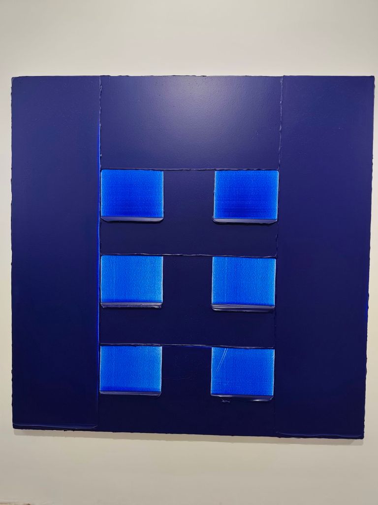 Se habla en el texto curatorial de Yves Klein, de Soulages, de Monet. Y sí, los ecos están ahí, pero Kmilo en mi opinión no es epígono de nadie. Klein radicalizó el azul hasta convertirlo en icono; Kmilo busca someterlo, lo fatiga, lo obliga a revelar sus contradicciones. Soulages exploró la luz desde la densidad del negro; Kmilo convierte el azul en superficie de fricción, en un no-lugar donde lo visible se quiebra. Monet se hundió en la contemplación acuática; Kmilo le añade la violencia del corte, el silencio que asfixia, la pausa incómoda antes del colapso.