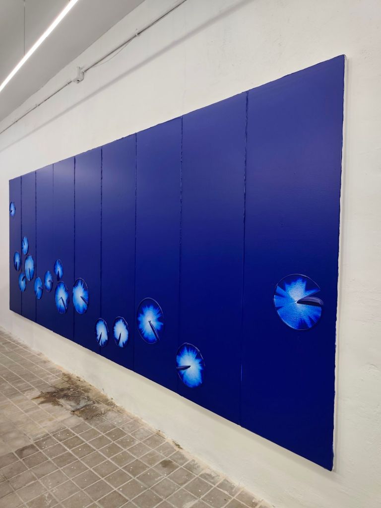 La instalación longitudinal —esa suerte de muro-alfabeto de círculos, golpes, interrupciones— opera como archivo del gesto. No es una serie; es una declinación. Cada círculo es un acontecimiento, un pulso, un instante donde la pintura deja de ser superficie para convertirse en espesor. Él lo sabe: la repetición es un mecanismo de exorcismo. Se repite lo que no se domina. El azul, en su mano, no es color: es obsesión.