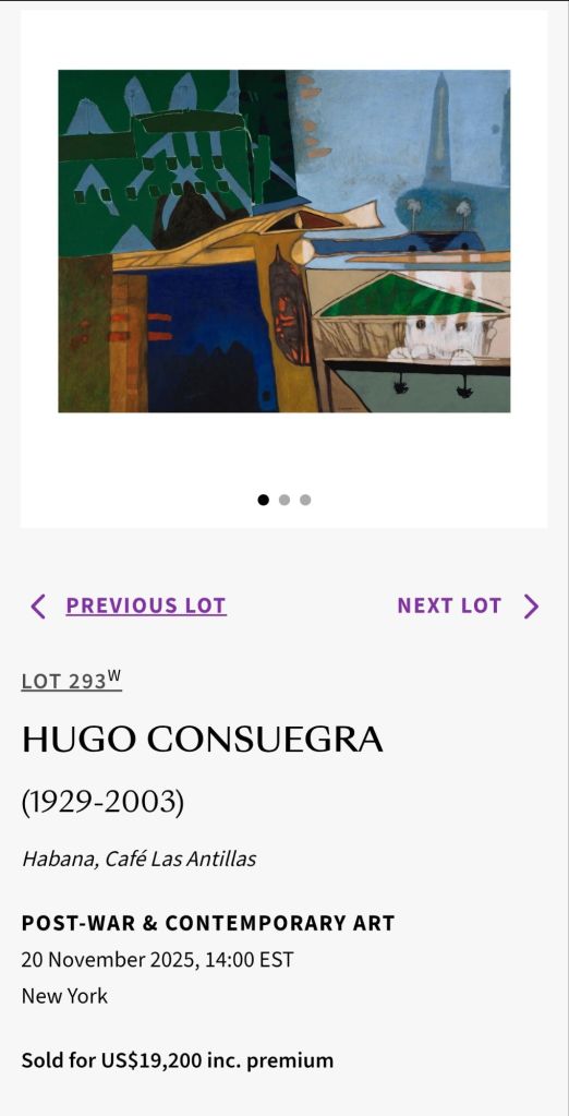 Dagoberto Rodríguez emerge con fuerza propia tras la desintegración de Los Carpinteros, y su obra aquí —un huracán geométrico construido con LEGO— responde bien a una demanda global de piezas híbridas entre arte, diseño y visualidad de datos. Se inscribe dentro de una tendencia mayor: la del coleccionismo atraído por propuestas que dialogan con tecnología, clima y cartografía. Hugo Consuegra se confirma como un valor firme dentro del mercado de artistas cubanos de la diáspora modernista: su abstracción simbólica y su mirada sobre La Habana como espacio mental encuentran un coleccionismo concreto, sostenido, aunque no masivo.