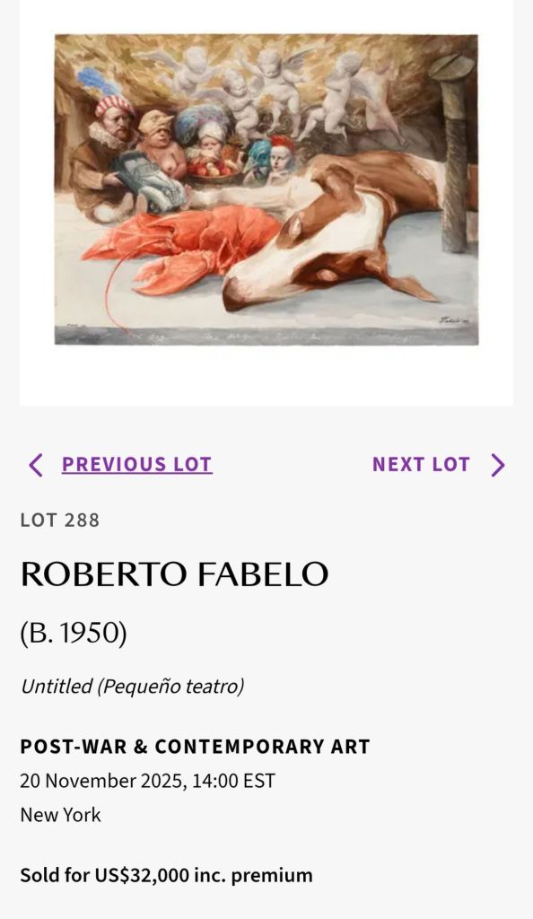 Lam continúa operando como un activo estable: no sorprende ni despunta, pero sostiene valor y credibilidad. Ana Mendieta evidencia la fuerza combinada de las narrativas feministas y decoloniales en el mercado contemporáneo: su obra ya no es leída como documento, sino como pieza central de museo. FGT, desde el minimalismo afectivo, mantiene su posición como artista de alta demanda institucional, donde el mercado replica el peso del aparato museístico. Antonia Eiriz y Loló Soldevilla se consolidan como dos vértices de una relectura histórica que el mercado está incorporando de manera tardía pero firme: ambas integran agendas curatoriales recientes, presencia académica creciente y una recuperación crítica que se ha ido traduciendo en precios. Fabelo, por su parte, reafirma su lugar como artista de alta presencia comercial, sostenido por un coleccionismo internacional que reconoce en su obra una mezcla eficaz de técnica, teatralidad y distintivo estilístico.