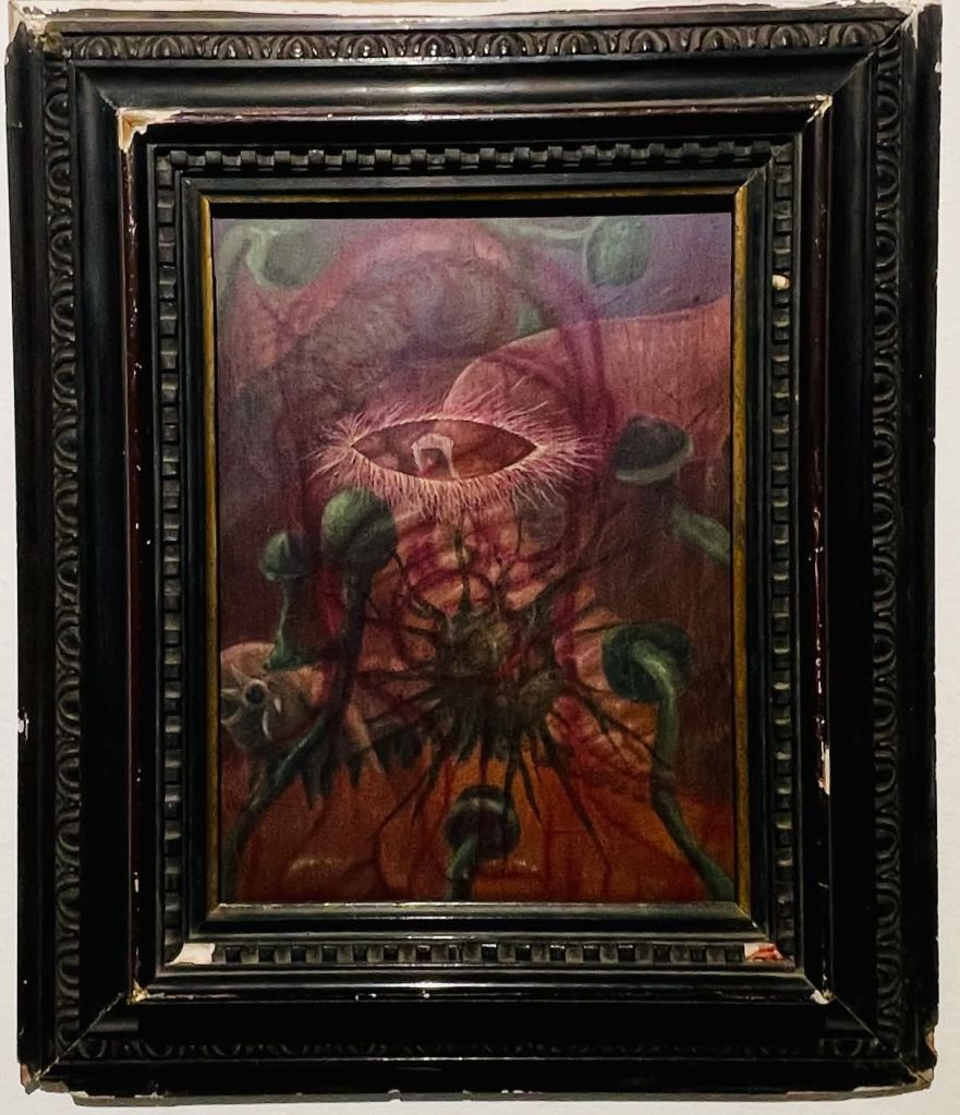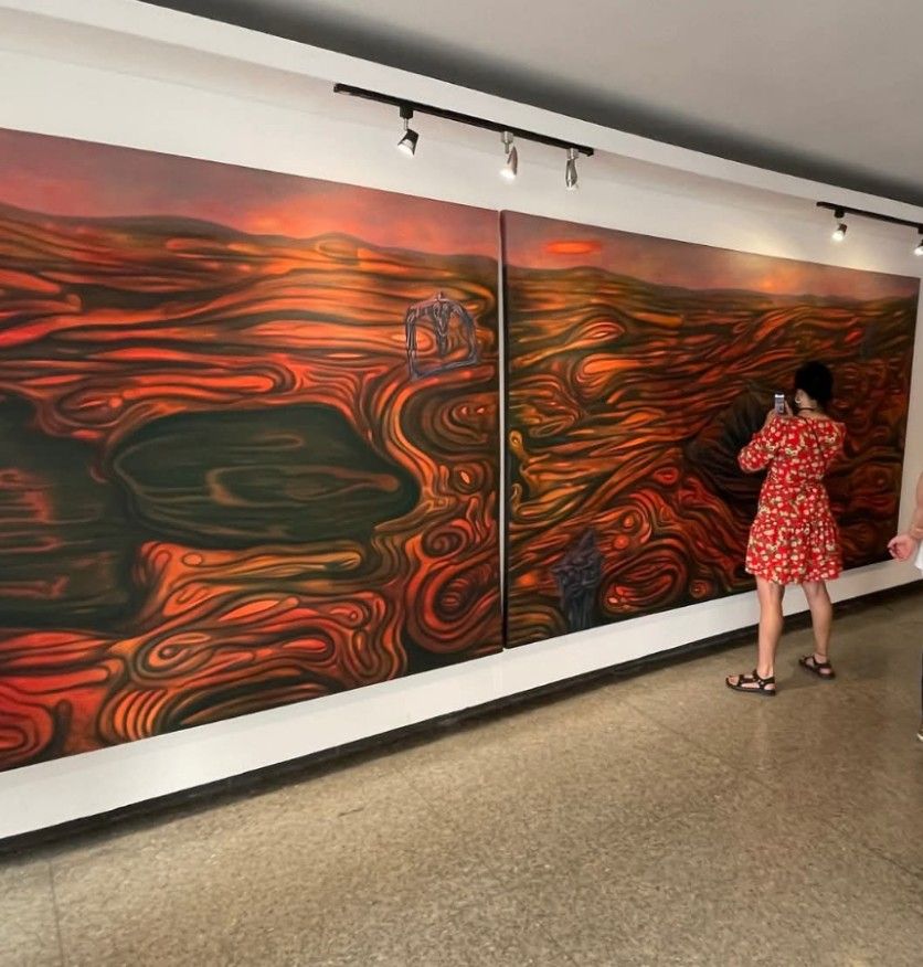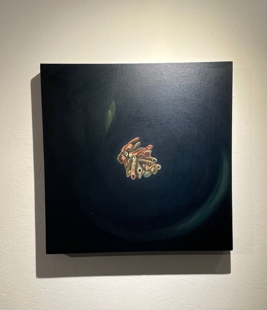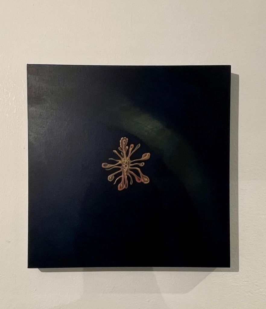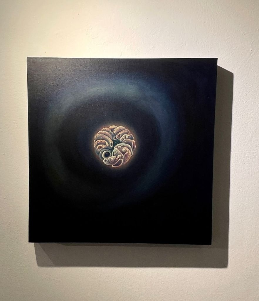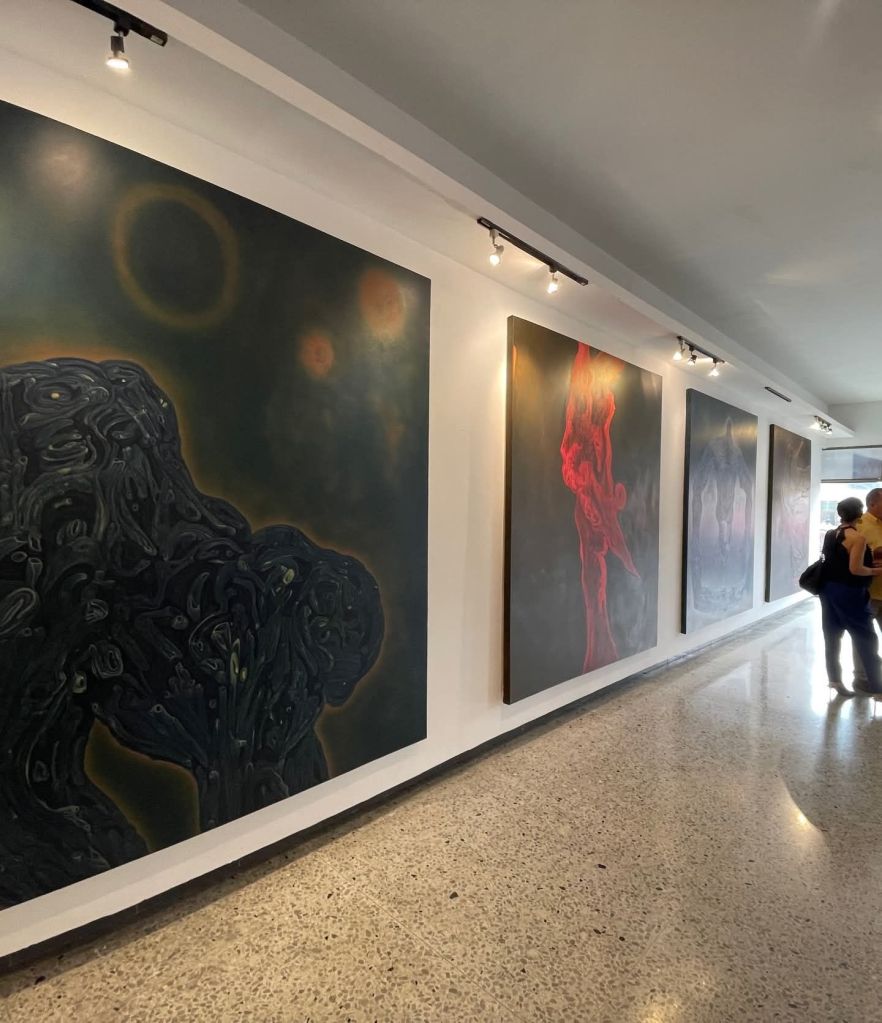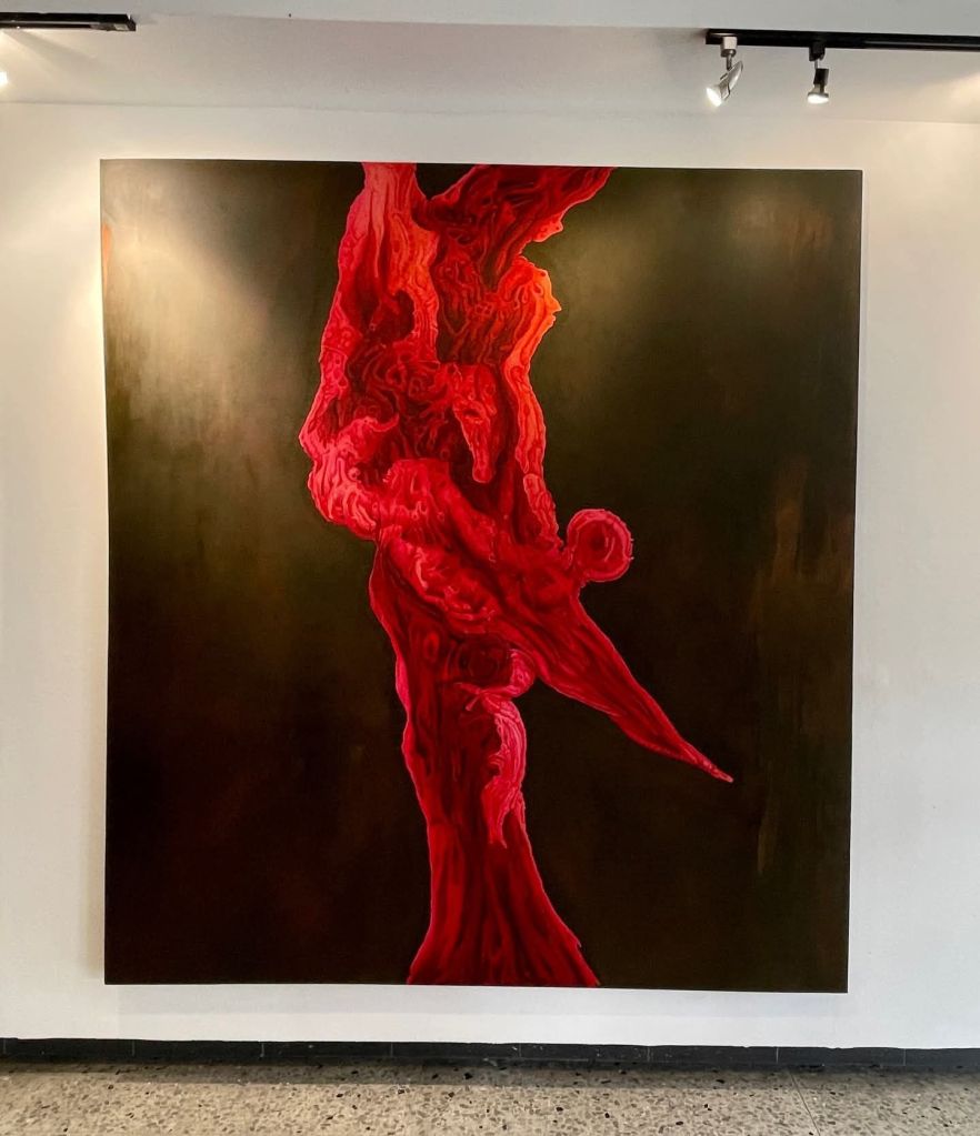 Ahora bien, Creatura vale también por otra razón. Aquí hay experimento. Aquí hay desplazamiento técnico. Estas piezas en óleo introducen una novedad apreciable dentro de su recorrido reciente. El óleo le permite a Dayron otra clase de espesura, otra clase de combustión, otra clase de transición entre fondo y forma. La superficie gana en vibración. Gana en respiración interna. Gana en una cualidad casi epidérmica que intensifica la lectura orgánica de las obras. No veo ese uso del óleo como un simple cambio de material. Lo veo como una decisión que acompaña el sentido mismo de la muestra. El óleo, en sus manos, favorece la mutación lenta, la densidad atmosférica, la aparición gradual de la imagen. Favorece, en suma, esa gramática de la metamorfosis que su obra venía buscando desde hace años. Esta vez la encuentra con mayor contundencia.