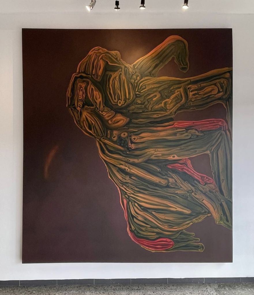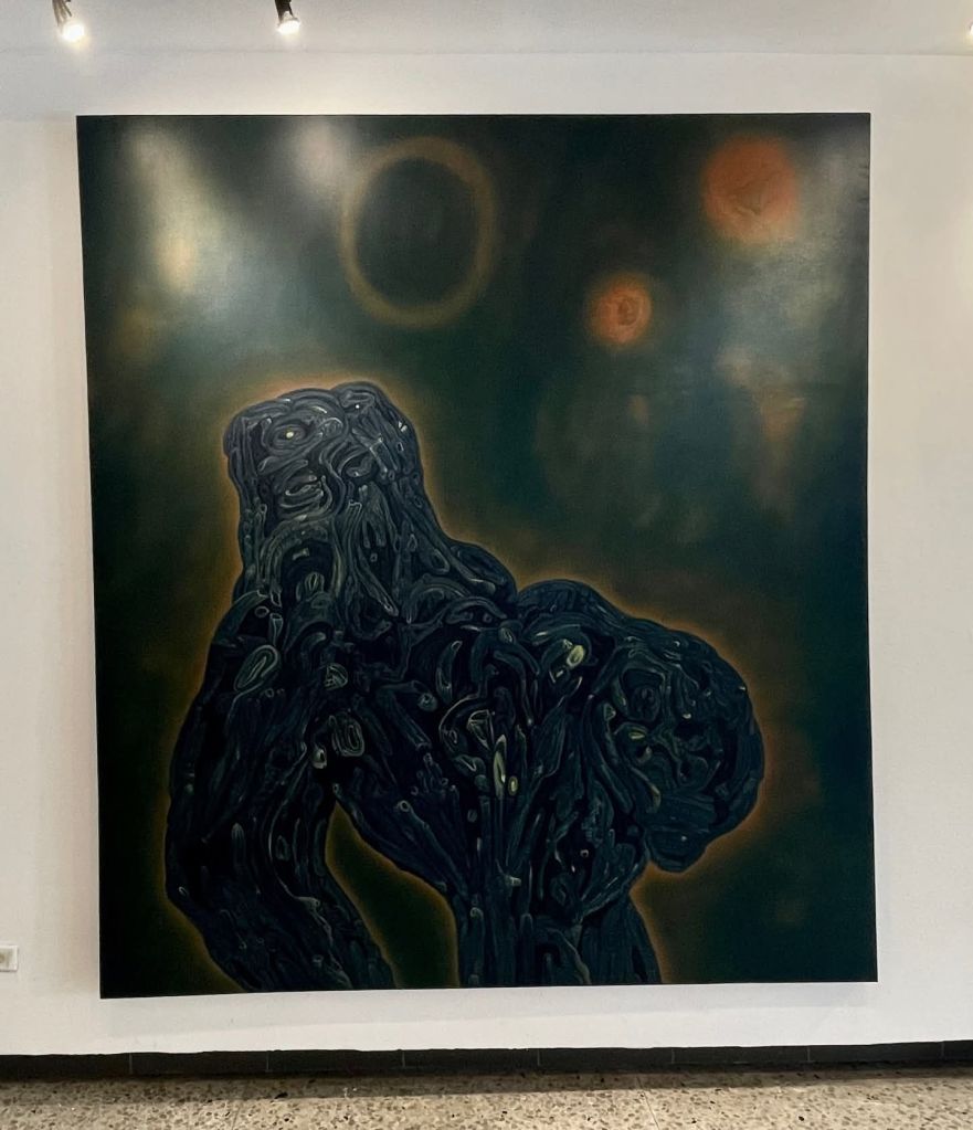 Por eso Creatura no me interesa como irrupción repentina. Me interesa como un paso más. Un paso firme. Un paso, además, de ampliación. Dayron no solo reafirma aquí una gramática propia. También la tensa. También la pone a prueba. En esta exposición hay una continuidad muy clara con sus búsquedas anteriores. Siguen ahí la materia en trance, la forma ambigua, el organismo sin especie fija, la sensación de latencia. Pero ahora el pintor empuja todo eso hacia una zona más densa, más corporal y más riesgosa. La imagen ya no se limita a sugerir un paisaje interior o una naturaleza transfigurada. La imagen se vuelve entidad. Se vuelve presencia. Se vuelve casi un cuerpo en proceso de emerger.